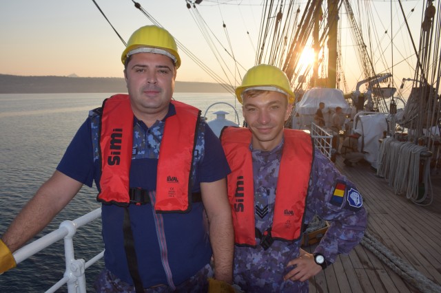 Nu sunt bucătari, dar trebuie să spunem că grupa de serviciu de la bucătărie formată în fiecare zi din cadeți are un rol foarte important pentru bucătarii navei. Cadeții sunt cei care îi ajută la curățarea cartofilor și a legumelor, la curățenie, la colectarea și sortarea deșeurilor. Este o muncă grea, cadeții recunosc asta și este serviciul cel mai greu pentru ei pe navă. Îi menționăm aici pentru că fără munca lor cea a bucătarilor ar fi mult mai grea dacă nu chiar imposibilă.