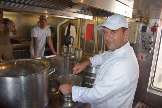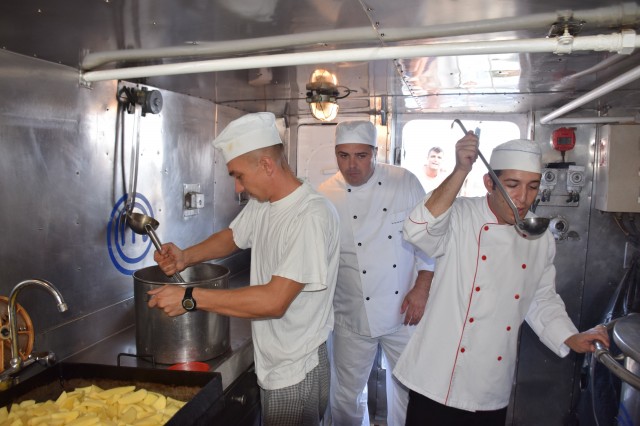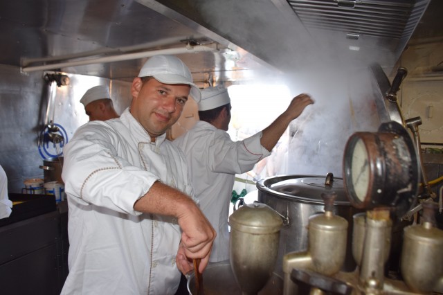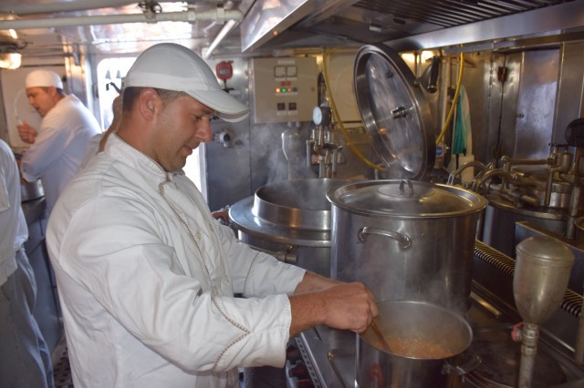 De la început, vă spun că mâncarea este bună, iar uneori chiar foarte bună la bord, deși unii au tendința de a mă contrazice și oricum cei șase bucătari de pe navă nu vor putea niciodată să împace pe toată lumea sau să gătească meniul perfect pentru toți membrii echipajului. Ajungi să apreciezi mâncarea de la bord doar atunci când ajungi să mănânci prost prin alte locuri și nu mă refer doar la alte nave. Poate nu vă vine să credeți dar cel mai vechi membru al echipajului este... un bucătar. Maistrul militar principal Corneliu Dumitriu a venit direct din promoție la navă și aici a rămas în următorii 25 de ani. Orice poveste despre bucătarii și bucătăria de pe N.Ș. Mircea ar trebui să înceapă cu el. Aproape două decenii și jumătate și-a petrecut jumătate din viață în spațiul îngust, fierbinte și plin de aburi de sub teugă, în bucătăria navei. Este adevărat însă că de aproape doi ani nu a mai pus mâna pe polonic, adică de când a trecut pe funcția de comandant grup intendență, dar acum hârtiile îi mănâncă viața. Oricum, tot în bucătărie îl găsești și nu pentru că face parte din fișa postului, ci pentru că altfel nu poate.