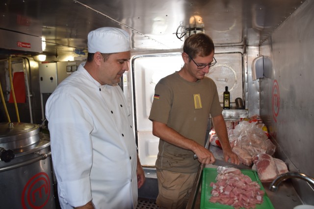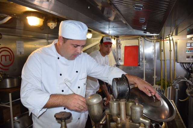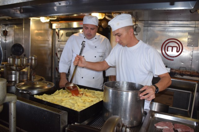 Dar, sufletul și personajul principal al bucătăriei din prezent este Mitică bucătarul, caporalul Dumitru Antochie pe numele lui întreg. În divizion este din anul 2004, iar la bord a ajuns în anul 2006. Adică din cei 36 de ani câți are acum, mai bine de 12 i-a petrecut în bucătăria navei și în tot atâtea marșuri spre supărarea soției și a celor doi copii. Poate părea iarăși ciudat, dar felurile de mâncare cele mai solicitante pentru bucătari sunt cele de genul fast-food: pizza, șaorma (greu de crezut, dar s-a gătit și asta), pentru că bucătăria este relativ mică, nu permite să te desfășori, este nevoie de multe cuptoare, etc. (odată cu instalarea noii friteuze, cartofii prăjiți nu mai sunt o problemă). Poate vă întrebați câți bucătari sunt la bord. Vă spun eu, sunt șase la număr, care lucrează în ture de câte trei, o zi cu o zi, dar în „vârfurile de sarcină” intervin toți. Mai sunt și doi bucătari germani, Marco Sohst și Stefan Hettich, care s-au adaptat cu ai noștri, având în vedere și experiența din marșurile anterioare, chiar dacă cele două bucătării sunt destul de diferite (de la gust și până la flux de muncă).