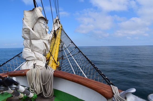 Pe măsură de depășim raionul Midia, vântul se arată propice întinderii velelor triunghiulare. Iată că momentul mult așteptat al navigației cu vele a sosit. Prin portavoce se dă comanda „La brațe în babord”, iar elevii își iau fiecare poziția desemnată la manevră. Aproximativ jumătate de oră și motorul se oprește făcând loc liniștii inconfundabile a navigației cu vele. Un maistru mecanic vitalist ajută și el la manevra velelor, iar unul dintre maiștrii puntiști îl privește zâmbind și îl tachinează spunându-i că velierele au ajutat la descoperirea Lumii Noi, nu propulsia mecanică.