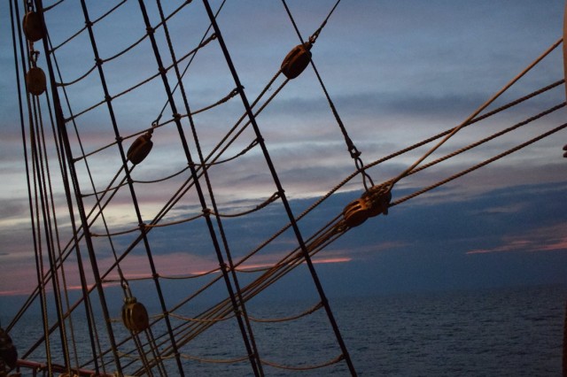 Cu o viteză relativ redusă, ce-i drept, vântul ne poartă către raionul de ancorare de la Gura Portiței, unde ajungem exact când apune soarele. Comandantul dă ordin să fie strânse velele. Astfel, cu razele stinse ale apusului coborându-le umbre pe chip, elevii militari își intră din nou în rolurile de la manevra velelor.