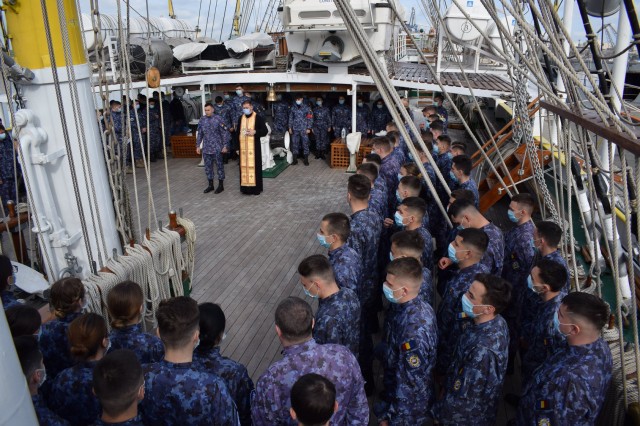 Înainte ca legăturile să se desprindă de la cheu și ca remorcherul să își intre în rol, la puntea centru începutul scurtului voiaj de instrucție pe mare a fost binecuvântat de preotul Trandafir Dragoș, care l-a avut alături pe elev caporal Sorin Moldoveanu, preot și el. Momentul solemn și-a atins menirea de a mângâia sufletele tuturor celor de la bord și de a sădi în ele vlăstarul speranței. Binecuvântarea și credința în forța divină au dat roade, căci aprilie și-a potolit capriciile și ne-a permis să navigăm pe o mare liniștită, sub un cer de un albastru sublim.