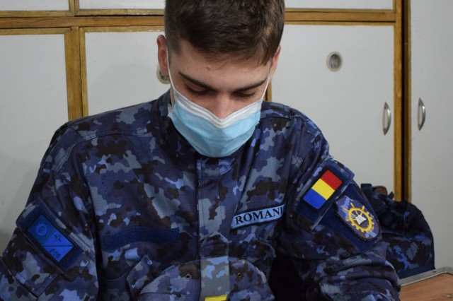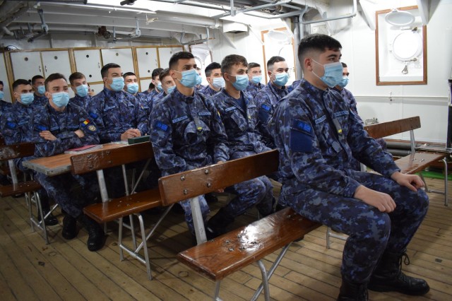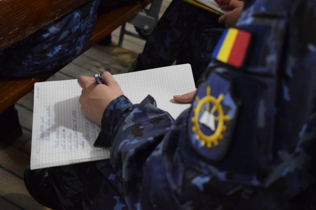 Protejați de ploaie de scurtele de camuflaj, elevii militari, își fac apariția, în șir indian, pe dană și, în aceeași formulă, urcă ordonat la bord. Programul zilei a fost reconfigurat astăzi, astfel încât elevii să petreacă mai mult timp la adăpostul cazărmilor. Instructorii militari îi împart din nou pe grupe și îi repartizează pe ateliere de lucru. Prima grupă ia loc în băncile din cazarma 3 pentru a lua notițe despre structura și osatura navei. Un aspirant și un maistru militar de vârste apropiate, le explică pas cu pas noțiunile care se derulează dinamic într-o prezentare PowerPoint. În timp ce unii elevii absorb gesticulația și discursul instructorilor, alții privesc cu încruntarea concentrării filele caietului studențesc în care iau grăbiți notițe despre activitatea zilei.