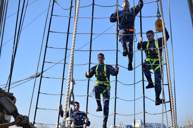În paralel, în prova, la arborele trinchet, restul elevilor militari, împărțiți pe grupe, exersează urcarea în arboradă cu trecere prin gabie. Sunt ajutați de maistrul militar clasa a III-a Remus Rogoz și de comandantul lor de companie, căpitan Marius Nazare, care astăzi are și el parte de o premieră: prima urcare în arborada navei-școală „Mircea”. De la baza catargului, de pe teugă, Lt. Scutelnicu analizează în detaliu performanța fiecărui elev și notează lucruri într-o agendă.