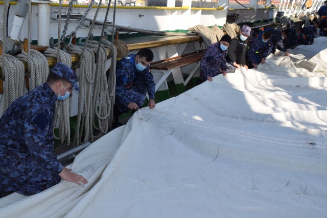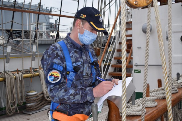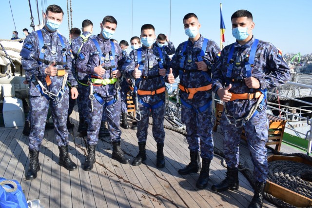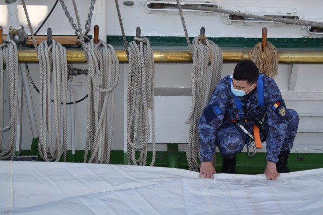 Conștiinciozitatea și perseverența elevilor militari sunt recunoscute deja de instructori, așa că ziua debutează oarecum în forță. Înainte de executarea manevrei de plecare de la cheu, de sâmbătă, mai sunt de învergat vele. La puntea centru a fost adusă vela gabier, care va fi învergată, așa cum îi sugerează și numele, pe verga gabier a arborelui trinchet. Cei care se ocupă de pregătirea velei pe punte sunt maistrul militar principal Ionuț Comună, maistrul militar clasa a II-a Cristian Gâzea, maiștrii militari clasa a V-a Marian Bosoi și Iulian Evsei. Activitatea are, firește, și scop didactic pentru o mână de elevi militari, care le dau profesioniștilor câte o mână de ajutor pentru legarea sacheților de învergare.