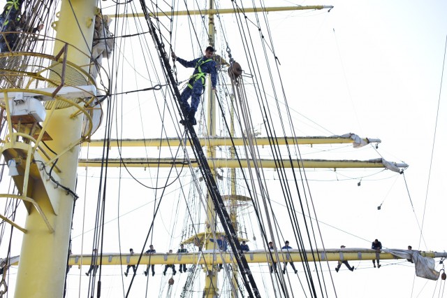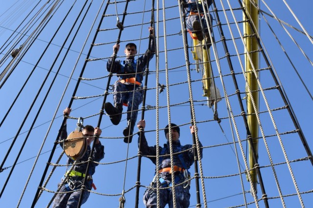 Cu pozițiile stabilite pe cele șase vergi ale arborilor centru și trinchet, mâine elevii militari vor fi desfășurați pe vergi pentru primul lor antrenament complet.