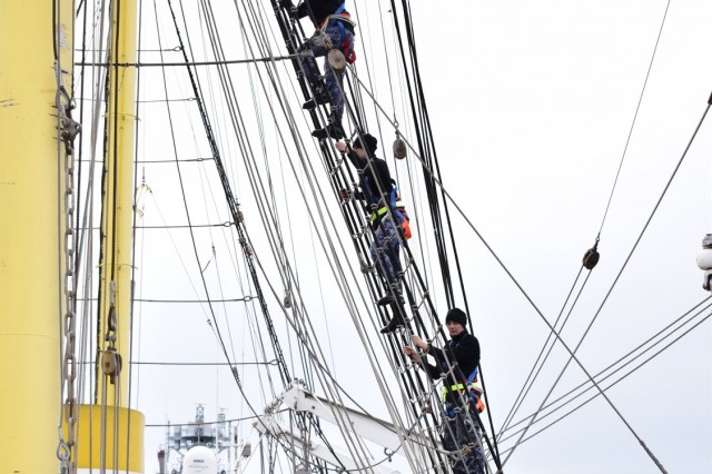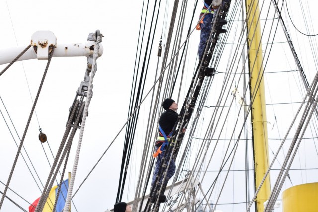 Primii care au urcat în arboradă au fost elevii din componența armamentului vergilor de la arborele centru, în timp ce pe puntea teugă maistrul militar clasa a II-a Cristian Gîzea le-a explicat armamentelor arborelui trinchet rolurile la brațarea vergilor.