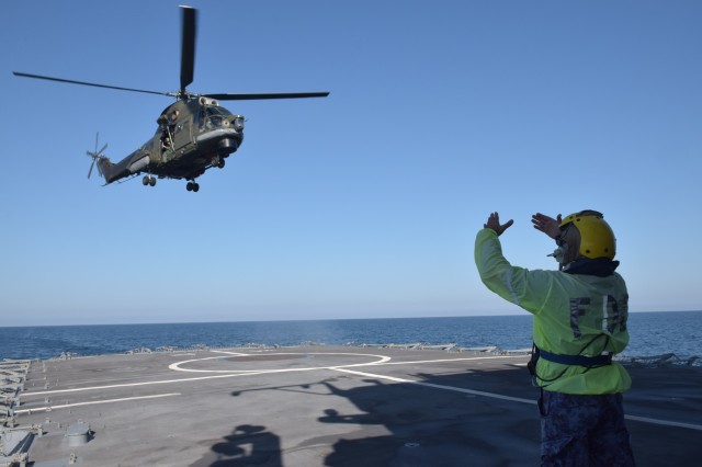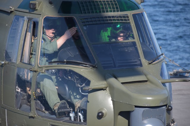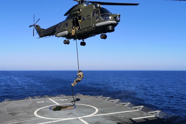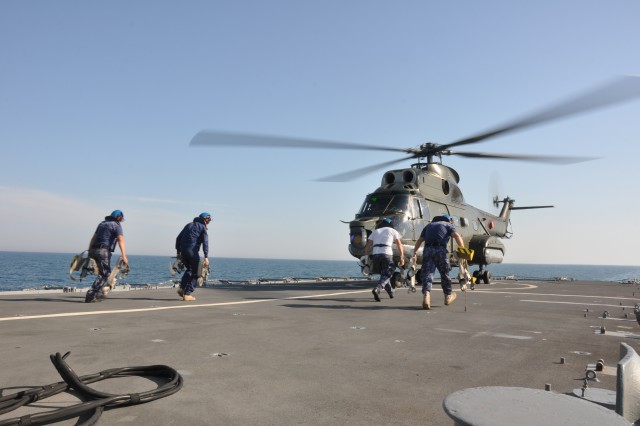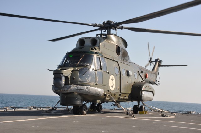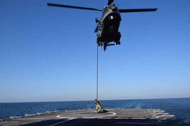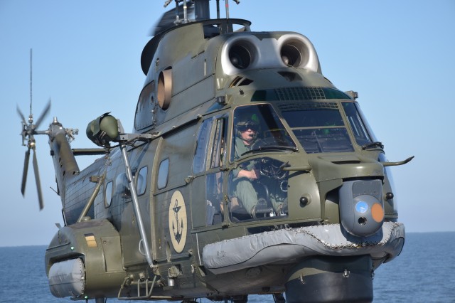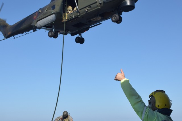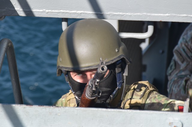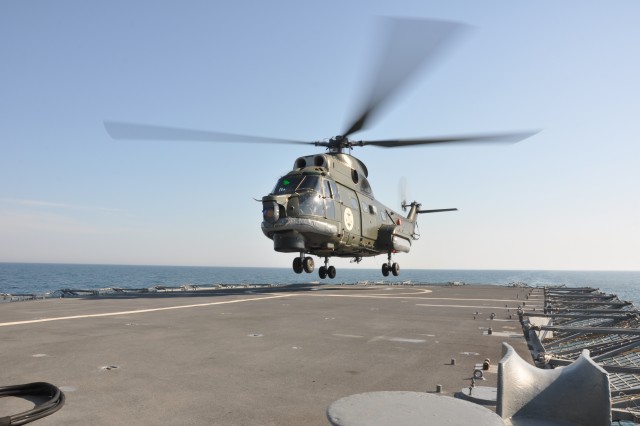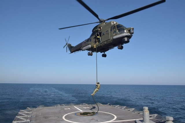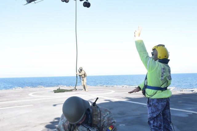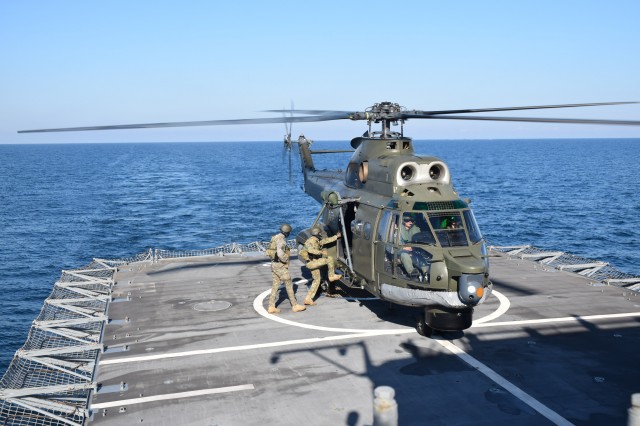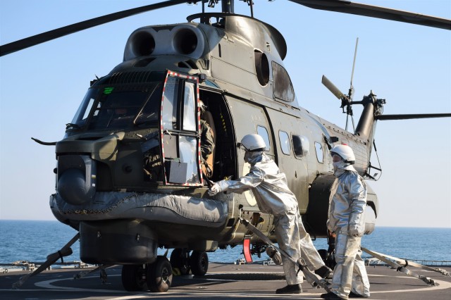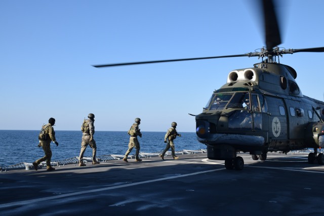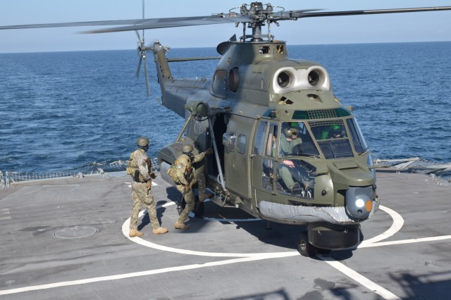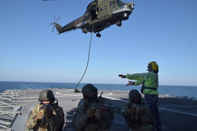 Echipa de scafandri de luptă, ambarcată pe F-222, a fost informată că la bordul unei alte nave comanda a fost preluată de un grup de persoane ostile. Așadar, s-a dat semnalul de alarmă pentru scafandri și personalul serviciului de luptă aviație. În cel mai scurt timp, totul a fost pus la punct, s-a dehangarat elicopterul și s-a pregătește de zbor, iar scafandrii de luptă s-au echipat pentru intervenție. Odată cu primii zori ai dimineții, pe puntea heliport a fregatei „Regina Maria”, palele elicopterului IAR 330 Puma Naval taie razele de soare, în rotația elicei gata de a ridica în aer impozantul aparat de zbor de șapte tone. Rând pe rând, scafandrii au urcat la bordul aeronavei care a decolat rapid pentru a interveni conform scenariului exercițiului. După câteva survoluri de cercetare, elicopterul a ajuns deasupra fregatei care are a primit rolul navei suspecte.