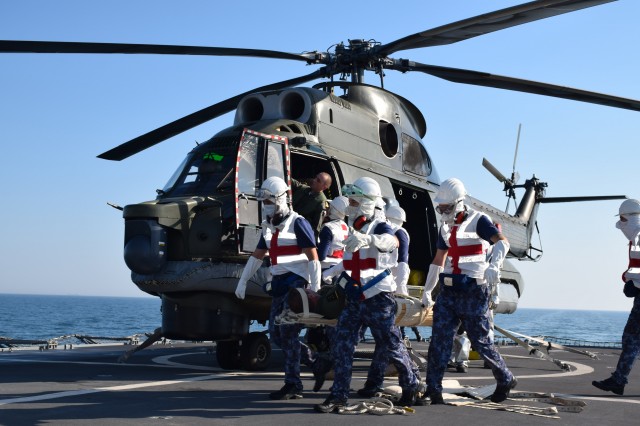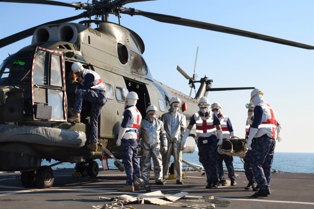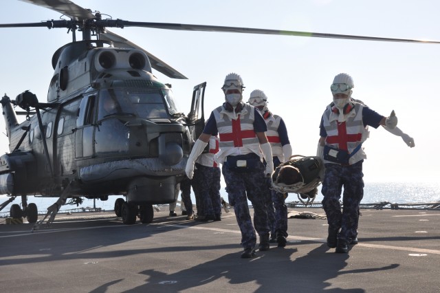 Pentru exersarea modului de acțiune a grupei permanentă de intervenție pe mare, a urmat în cadrul scenariului fictiv prăbușirea elicopterului pe punte. Anunțul aeronavei ce simula o avarie la unul dintre motoare a declanșat semnalul de exercițiu, transmis prin instalația de amplificare a navei. Echipajul fregatei „Regina Maria” s-a mobilizat pentru evacuarea compartimentelor aflate sub puntea avariată, personalul nominalizat la barca de salvare s-a prezentat la post împreună cu înotătorul de serviciu, iar nava a ridicat starea de pregătire pentru luptă la nivelul de alertă.