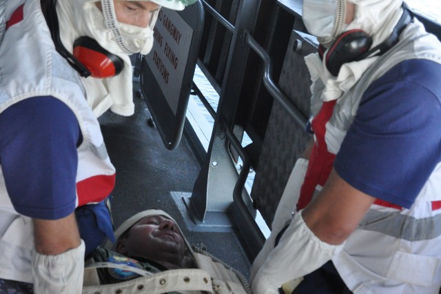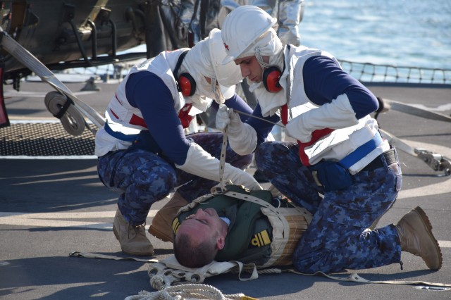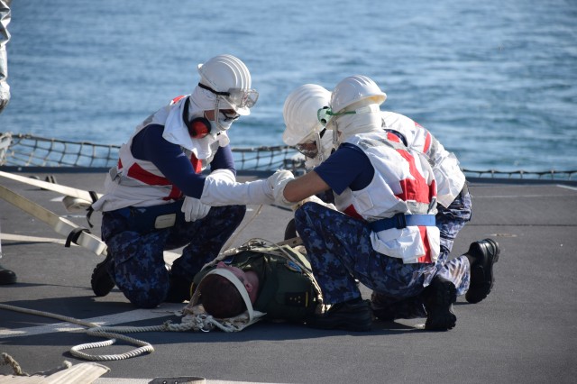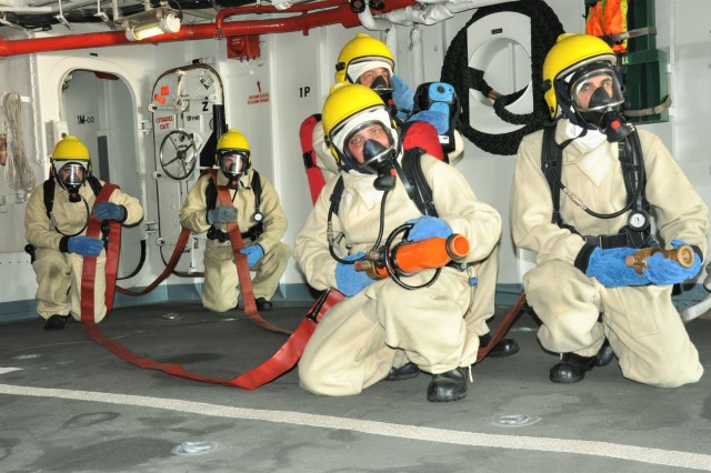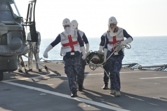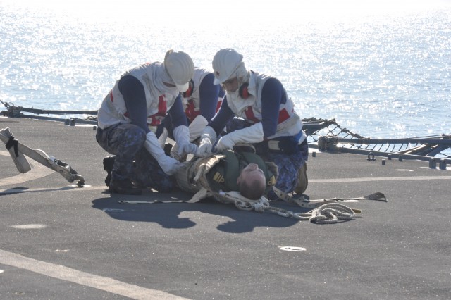 „Prăbușire pe punte! Prăbușire pe punte!”, a fost anunțul care a comunicat momentul impactului aeronavei cu puntea fregatei. Echipa de vitalitate a acționat conform baremelor standard ale Alianței, echipându-se fără întârziere în combinezoanele de protecție și întinzând furtunele de apă pentru izolarea incendiului. Echipa medicală a fost de asemenea pregătită pentru preluarea rapidă, transportul în siguranță și tratarea răniților din elicopter în încăperea cea mai spațioasă de pe navă. Careul plin de echipamente medicale, de răniți întinși pe tărgi și de personal sanitar a fost transformat într-un centru de primire a urgențelor.