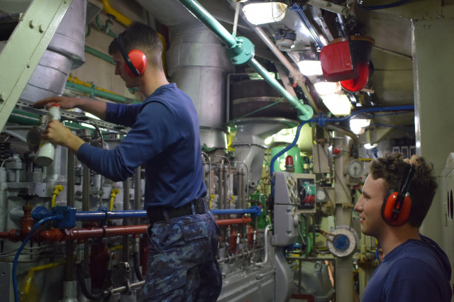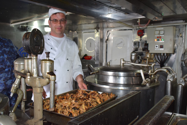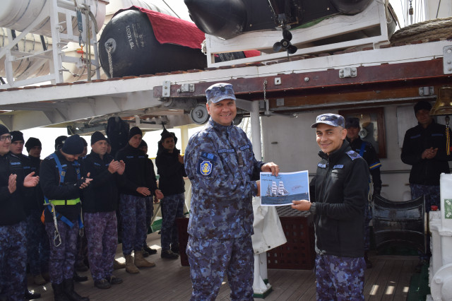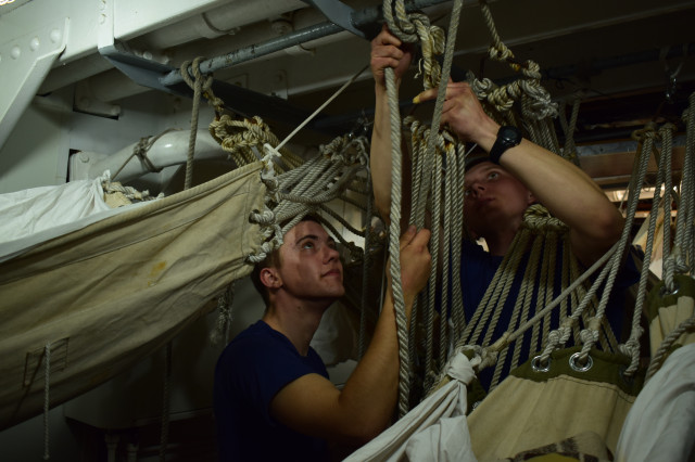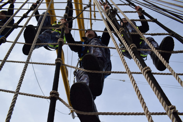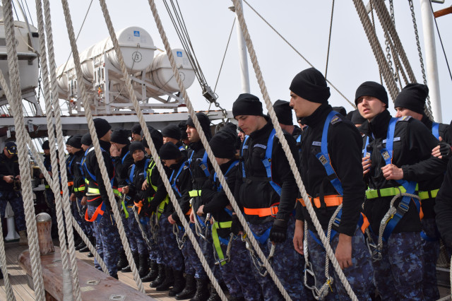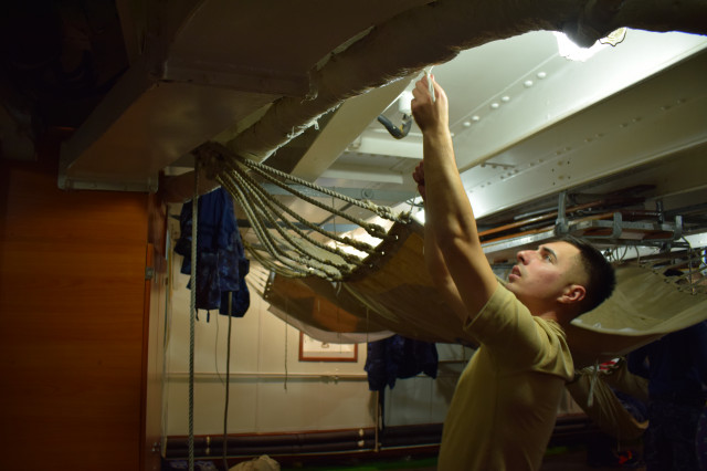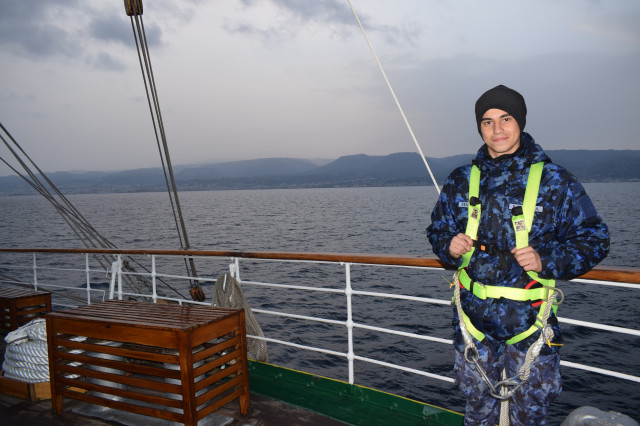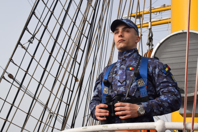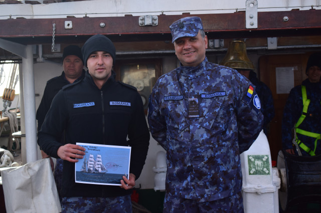 Tot la puntea centru, în fața formației, primesc felicitări și cei doi sărbătoriți ai zilei, soldatul Vîjian Florin – unul dintre bucătarii care au zi de zi grijă de noi și elevul fruntaș Andrei Bogheanu, care a împlinit 22 de ani în cel mai inedit mod cu putință. Băiatul este din Constanța și spune că a ales cariera militară la îndemnul tatălui său, care știa că el are o pasiune pentru mediul cazon și l-a sfătuit să o transforme în profesie urmând cursurile Școlii Militare de Maiștri Militari a Forțelor Navale. „Este o experiență interesantă, ce-i drept. Mi-aș fi dorit să îmi petrec ziua de naștere, la cheu, într-un port, nu neapărat pe o mare de gradul 4, dar asta am ales să fiu, marinar militar și chiar îmi place”, afirmă sărbătoritul. Despre experiența de până acum de la nava-școală, elev fruntaș Andrei Bogheanu spune că este cu adevărat o provocare, în special prin prisma traiului la comun într-un spațiu restrâns și, invocă desigur și dormitul în hamac, un aspect care a oferit sentimente amestecate pentru nenumărate generații de marinari militari: unii ajung să-l agreeze, alții... deloc.