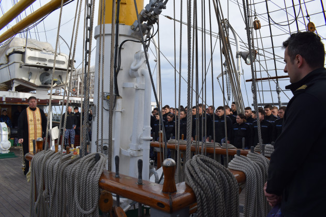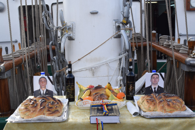 Chiar dacă din exterior poate părea un clișeu, echipajul unei nave ajunge să prindă cheagul specific al familiei. Legăturile sudate la bord, răcite cu apă sărată de mare, devin indestructibile. Cu puțin înainte de a porni în acest marș de instrucție, marinarii militari și-au condus pe ultimul drum doi camarazi excepționali, pe sublocotenenții (p.m.) Sergiu Bosoi și Vlad Carp. Amintirea lor este și va rămâne vie. La data la care s-au împlinit 40 de zile de la trecerea lor la cele veșnice, la bordul navei-școală a fost oficiată o ceremonie religioasă de pomenire a celor adormiți. O emoție apăsătoare a planat la puntea centru, sub deviza „Onoare și Patrie”, unde preotul bordului, plt.adj. Trandafir Dragoș a dat glas cuvântului lui Dumnezeu pentru izbăvirea sufletelor celor înălțați pe veci la ceruri. Momentul a fost o confirmare a zicalei potrivit căreia ochii sunt fereastra sufletului. În privirile întregului echipaj s-au citit permanent durerea și regretul, dar și noblețea virtuții camaraderiei.