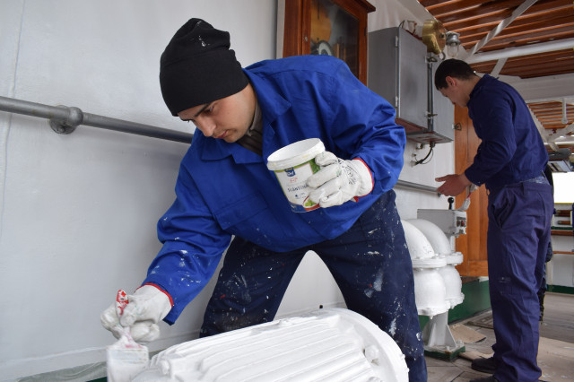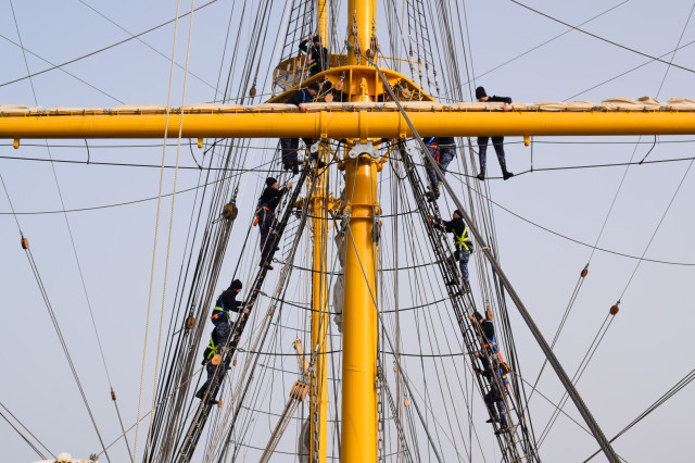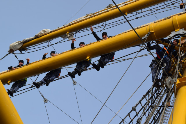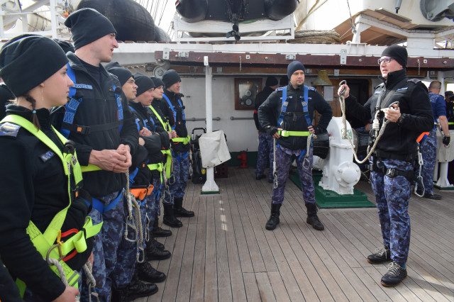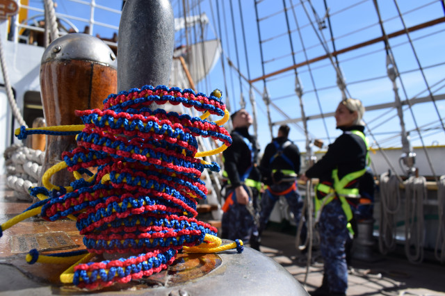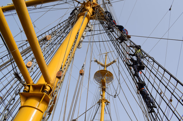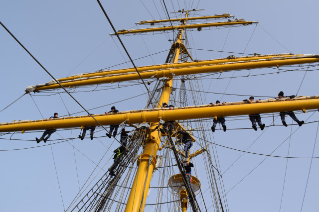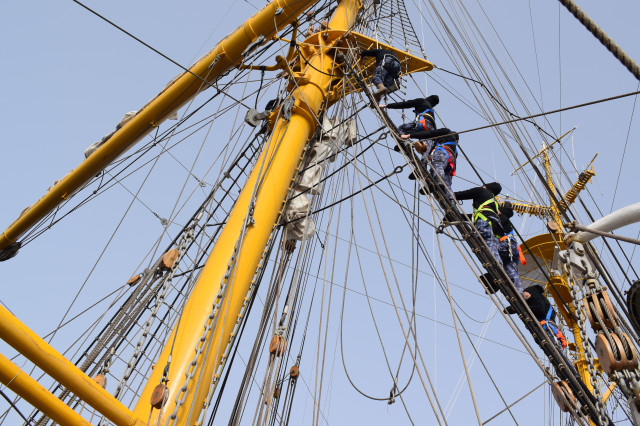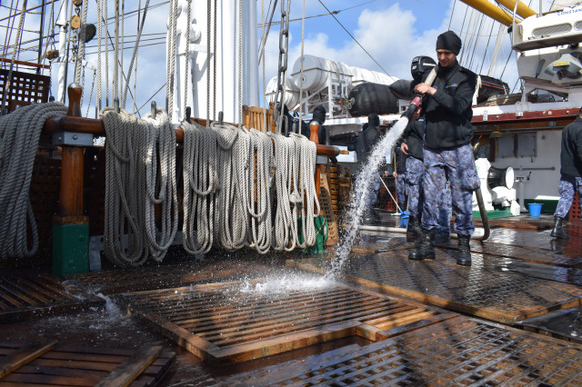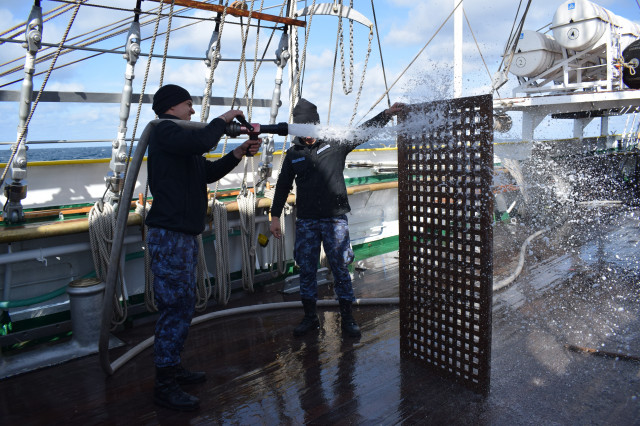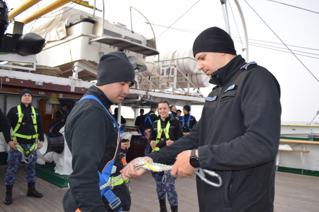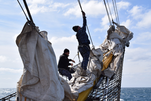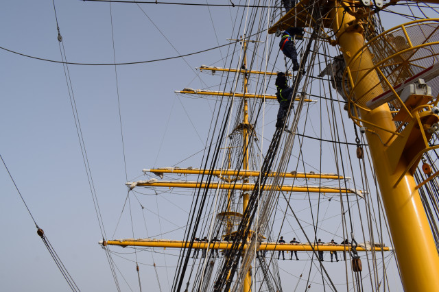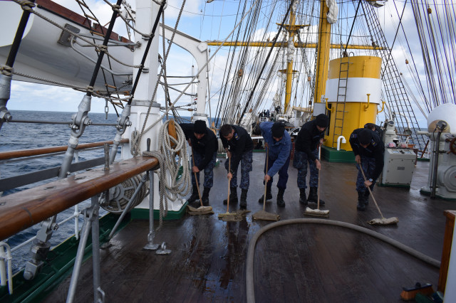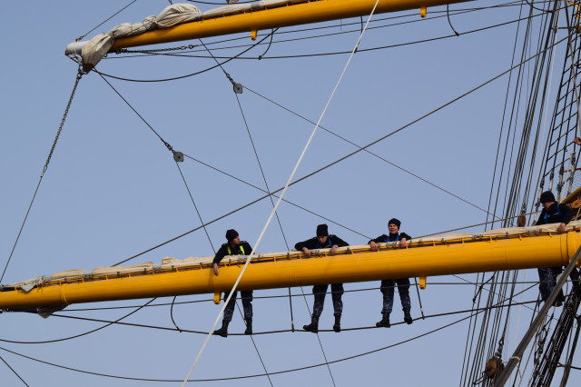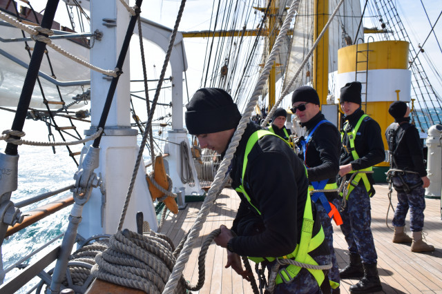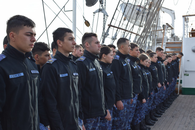 Desfășurarea pe vergi și salutul din arboradă le-au ridicat semnificativ tonusul elevilor militari, după zilele în care marea învolburată i-a ținut mai mult la interior și i-a forțat să lupte, așa cum descriam într-o corespondență anterioară, cu chipul mai puțin agreabil al vieții de navigator – răul de mare.