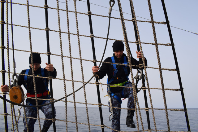 Înainte de a urca în arboradă și de a păși pentru prima dată pe țapapie, fiecare elev militar este atent evaluat de către cel puțin doi instructori militari și este întrebat dacă își dă acordul scris că se simte apt să urce acolo unde urmează să fie distribuit. Soldatul Căldare Bianca coboară cu zâmbetul pe buze din arboradă. Încă nu știe cu ce calificativ au notat-o instructorii, dar noi vrem să-i aflăm impresia la cald. „O să ocup poziția de contragabier la arborele trinchet, în farul prova și sunt entuziasmată”, afirmă tânăra, care de 11 ani practică handbal de performanță și care, atunci când nu este echipată cu ținuta de instrucție, îmbracă echipamentul echipei constănțene de handbal CSU „Neptun”.