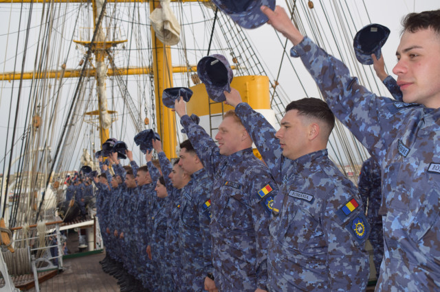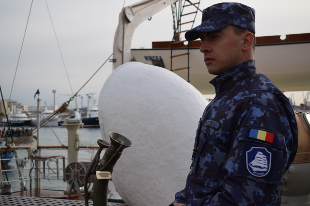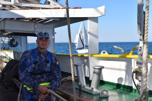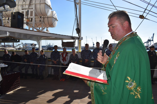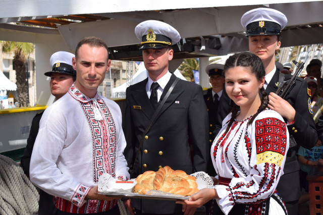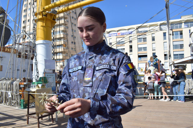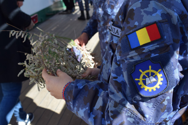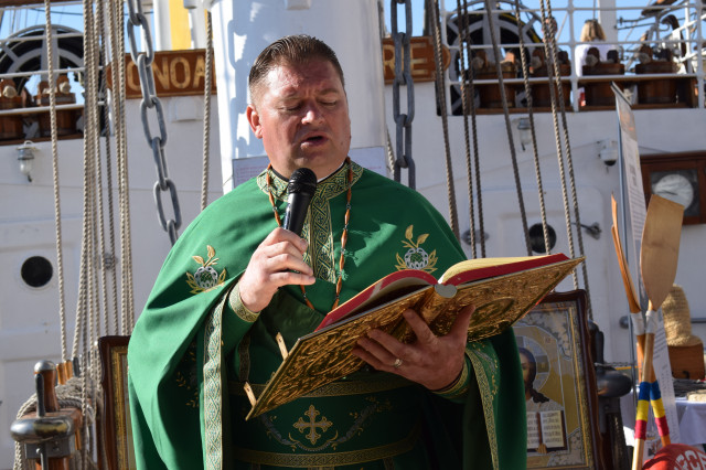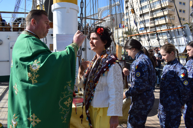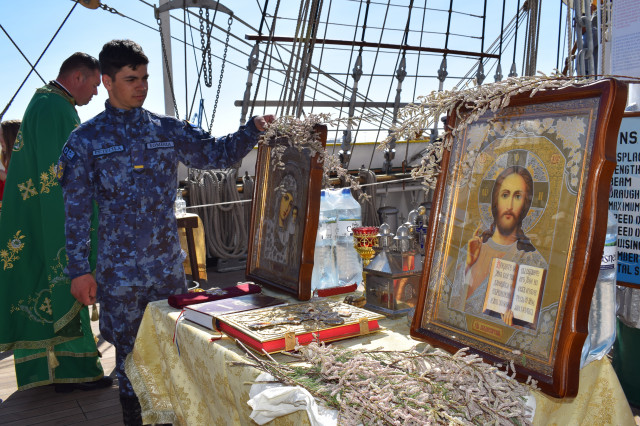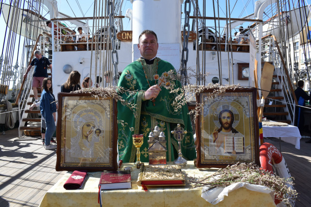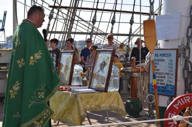 După ceremonia de ridicare a pavilionului, preotul bordului, plutonierul adjutant Trandafir Dragoș, a amenajat, la puntea centru, sfânta masă și a oficiat slujba de Florii, atât pentru echipajul navei, cât și pentru vizitatorii care au ținut să asiste la momentul solemn, să filmeze și să fotografieze.