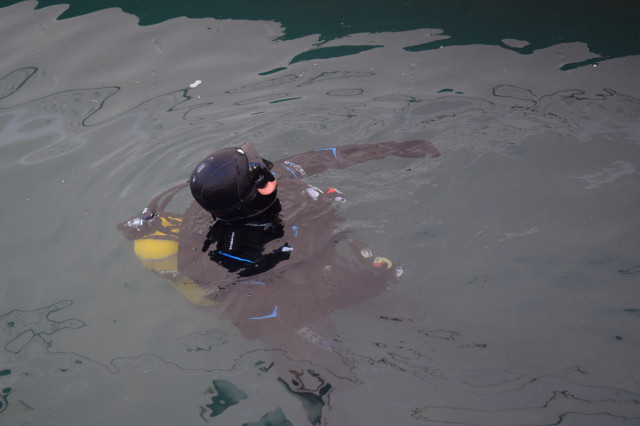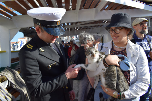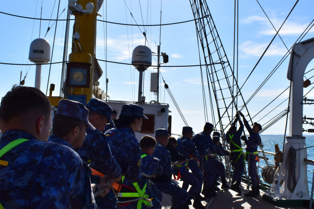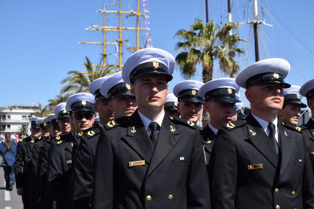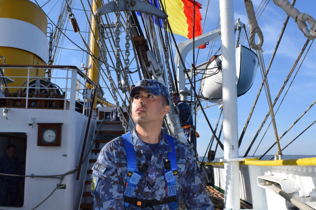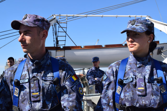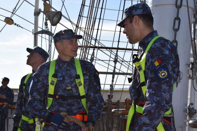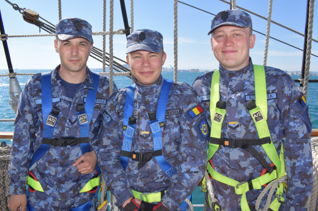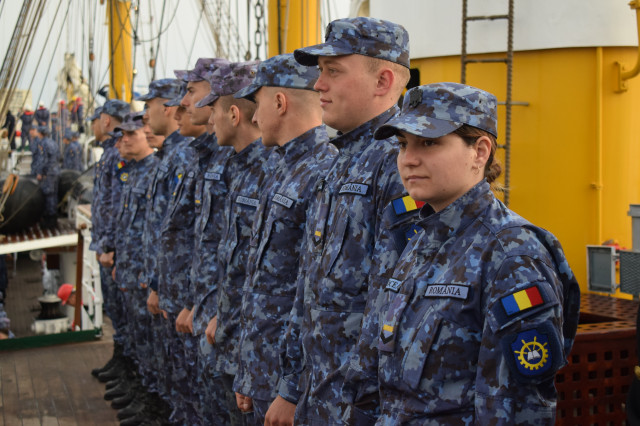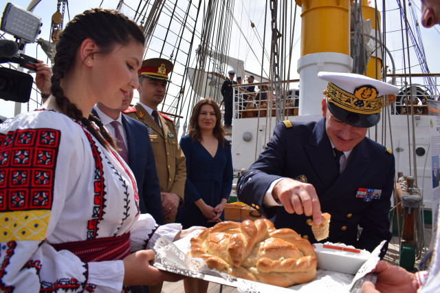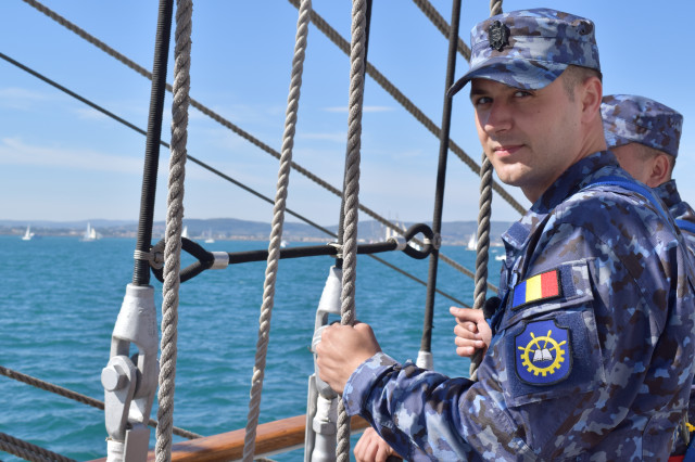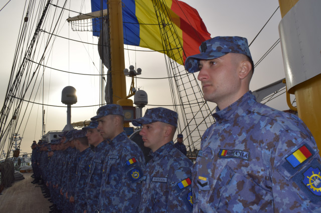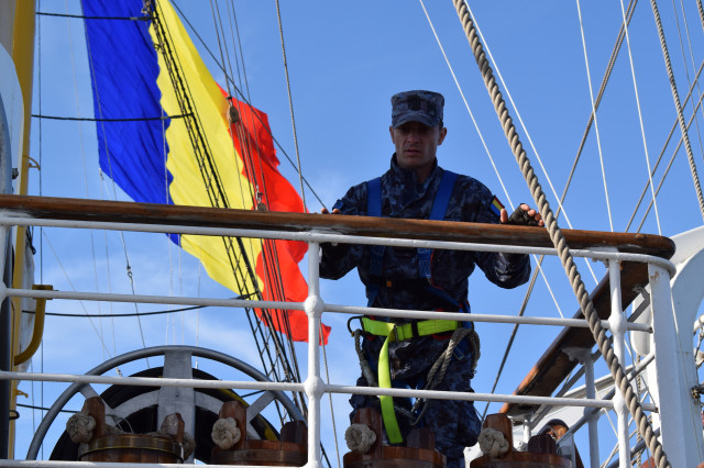 După ceremonia de ridicare a pavilionului, preotul bordului, plutonierul adjutant Trandafir Dragoș, a amenajat, la puntea centru, sfânta masă și a oficiat slujba de Florii, atât pentru echipajul navei, cât și pentru vizitatorii care au ținut să asiste la momentul solemn, să filmeze și să fotografieze.