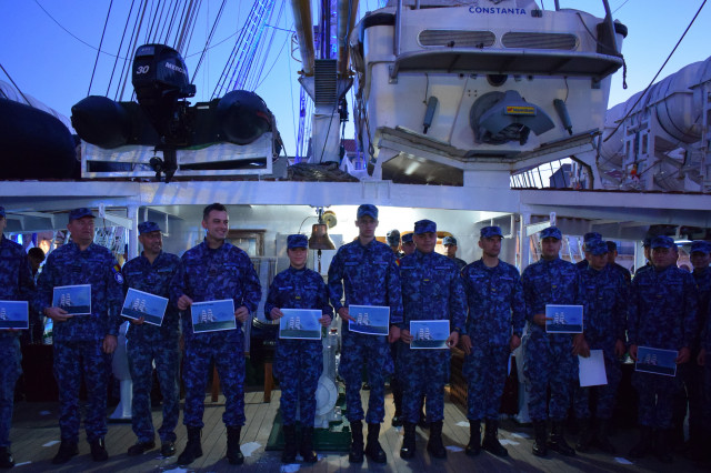 Chiar înainte de răsăritul soarelui, comandantul navei, comandorul Mircea Târhoacă, a ținut să îi felicite pe cei 10 sărbătoriți de la bord și să le ofere, așa cum este obiceiul la astfel de ocazii, câte o diplomă de apreciere.