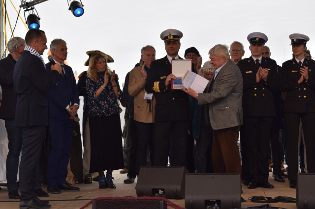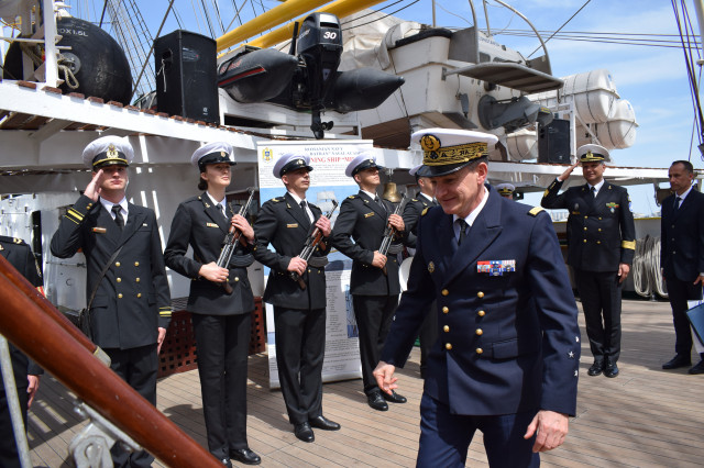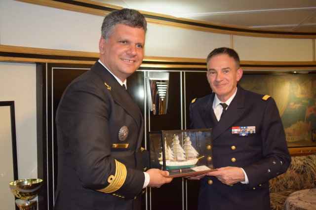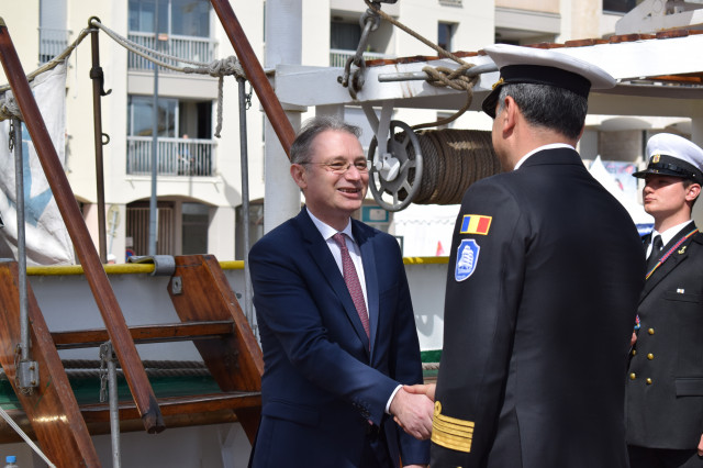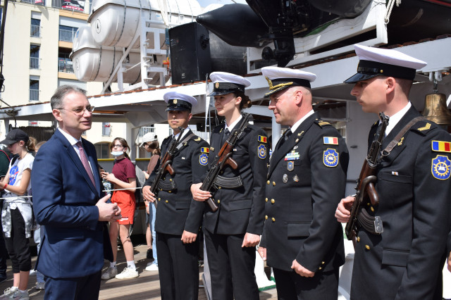 Bucuros de revederea cu echipajul NS „Mircea”, precum și cu ansamblul de dansatori a fost și Ambasadorul României la Paris, Excelența Sa Luca Niculescu. Acesta ne-a vizitat în cea de-a treia zi a șederii noastre în Sète, însoțit de prefectul maritim al Mediteranei, viceamiralul Gilles Boidevezi. care a fost interesat să afle specificul activităților de instrucție de la bordul navei-școală.