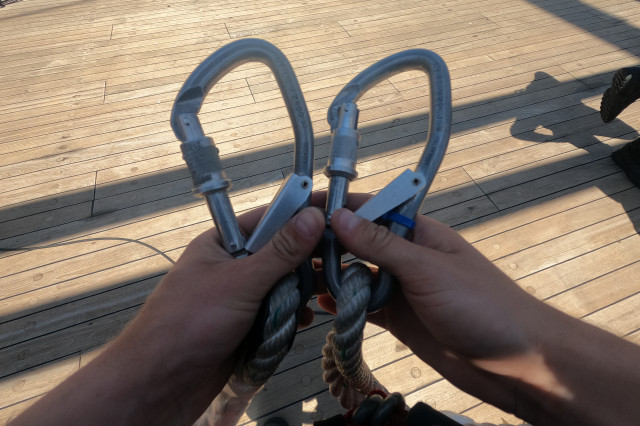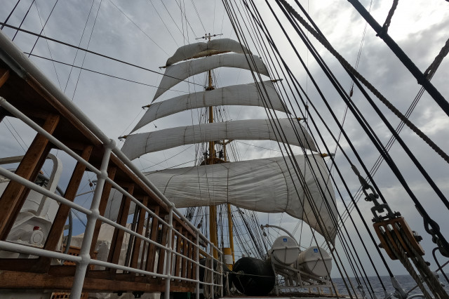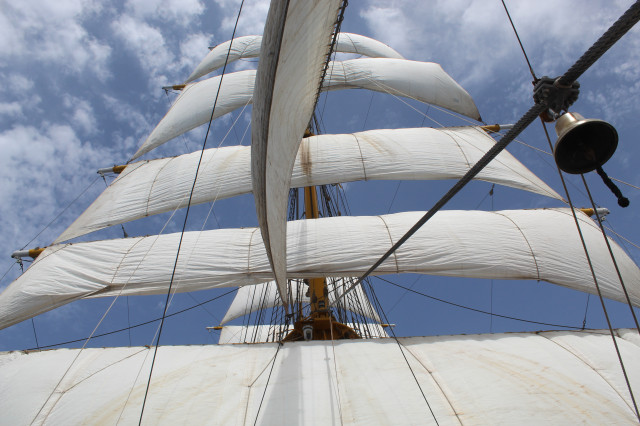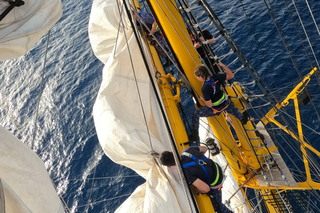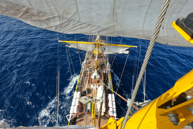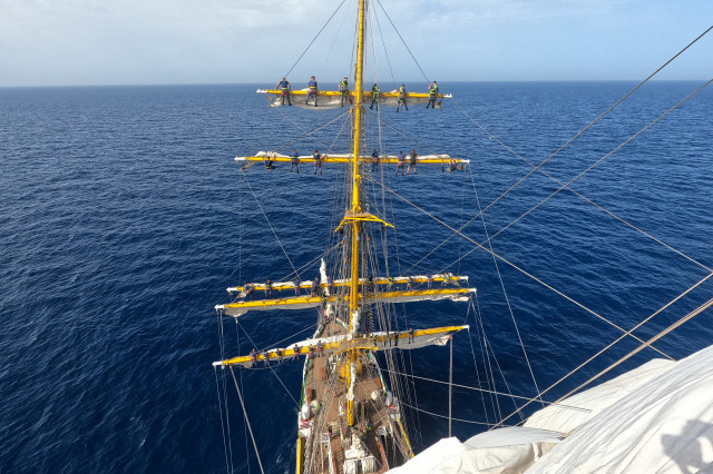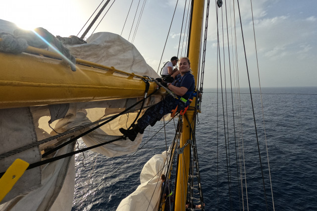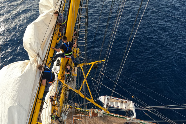 După ce, cu câteva zile înainte s-au desfășurat velele de la partea inferioară a arborelui trinchet și a arborelui mare, a doua zi de la plecarea din Genova studenții, sub atenta îndrumare a instructorului Mm IV Bogdan Blaj, au urcat în arboradă. Sub comanda ofițerului secund, locotenent Ștefan Scutelnicu, s-a trecut la desfășurarea tuturor velelor de pe arborele trinchet și arborele mare.