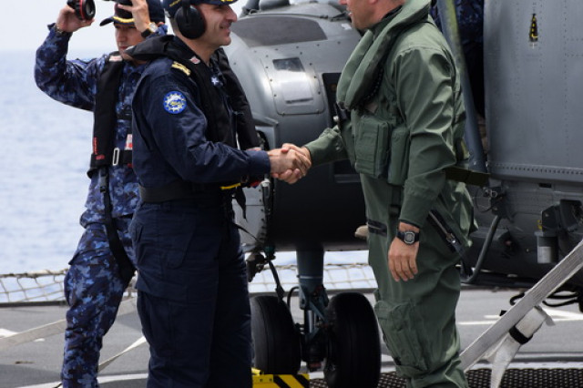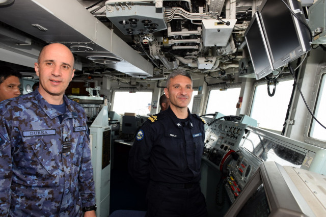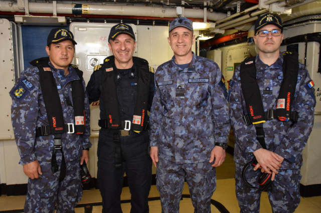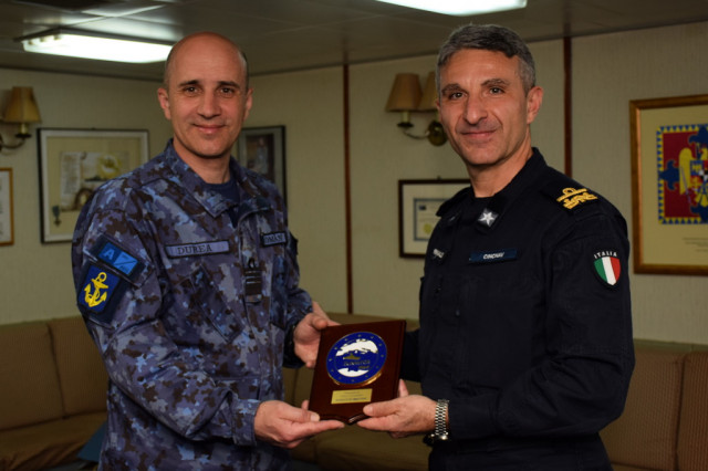 Ziua de joi, 18 mai, a cuprins un program diferit față de cel din zilele obișnuite de misiune, dat fiind faptul că navele din gruparea navală a Operației IRINI, fregata „Regele Ferdinand”, nava auxiliară germană FGS „Bonn” și fregata italiană ITS „Libeccio”, au desfășurat exerciții comune pe mare, manevre și evoluții navale, o secvență de fotografiere aeriană, precum și o activitate de reaprovizionare cu combustibil, pe mare. Cu acest prilej, comandantul grupării, contraamiralul de flotilă Valentino Rinaldi, ambarcat la bordul fregatei ITS „Libeccio”, a efectuat o vizită la bordul fregatei „Regele Ferdinand”, pentru a transmite aprecierea sa față echipajul navei și pentru a se întâlni cu echipa de comandă a acesteia. Împreună cu contraamiralul de flotilă Valentino Rinaldi, la bordul navei militare românești au venit și doi dintre ofițerii români care fac parte din statul major ambarcat, căpitan-comandor Sevghin Osman și căpitan Daniel Nedelcu, iar transportul acestora a fost realizat cu elicopterul Puma Naval. Comandantul grupării navale a subliniat faptul că fiecare militar participant la Operația IRINI are un rol important în desfășurarea acesteia și că este sigur de faptul că Forțele Navale Române vor continua să prezinte un nivel ridicat de profesionalism și la această participare alături de partenerii din gruparea navală.