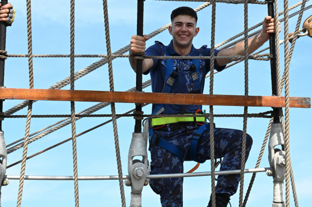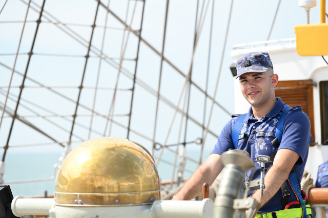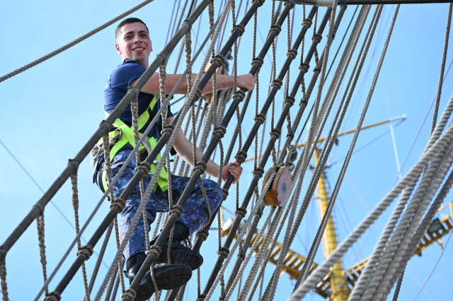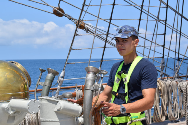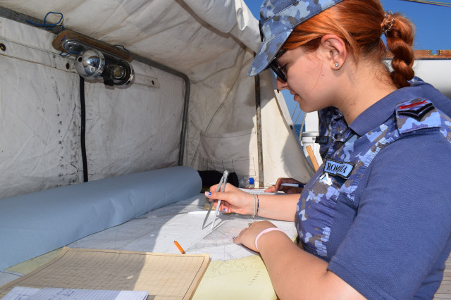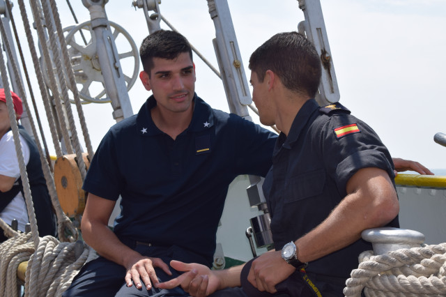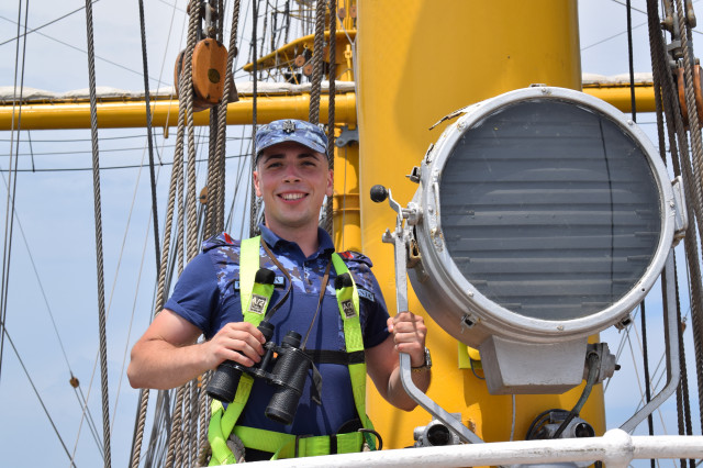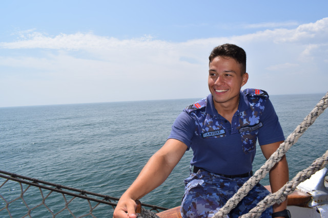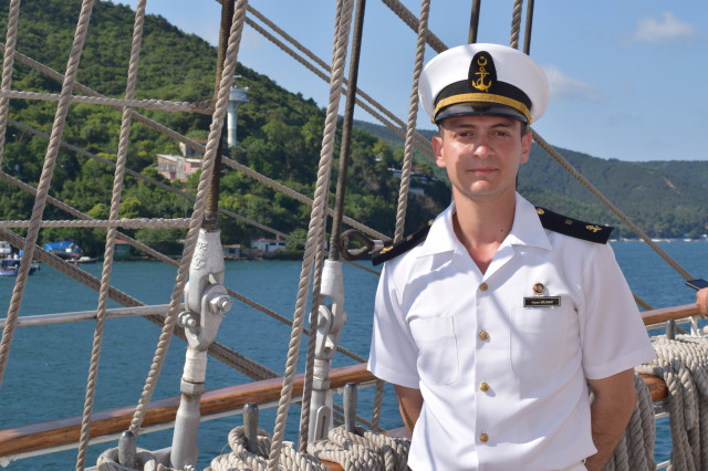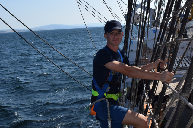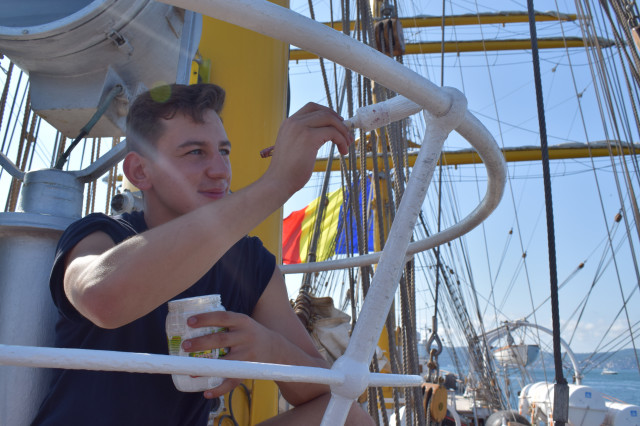 Student caporal Maria Enache este gălățeancă, din Tecuci, absolventă de colegiu militar și fascinată de oportunitățile învățământului superior de marină. „Când am urcat prima dată pe navă, deși eram la cheu, am simțit că mi se face rău, dar apoi, în marș, n-am mai avut nicio problemă. Activitățile din programul zilnic sunt prea multe și spre solicitante ca să mai avem timp să ne gândim la micile neajinsuri. În ceea ce privește urcatul în arboradă, îmi era frică la încept, dar am urcat, iar după ce m-am dat jos din arboradă cu foarte multă adrenalină și am uitat complet de teama de înălțime”, afirmă studenta.