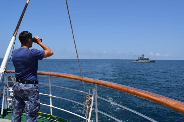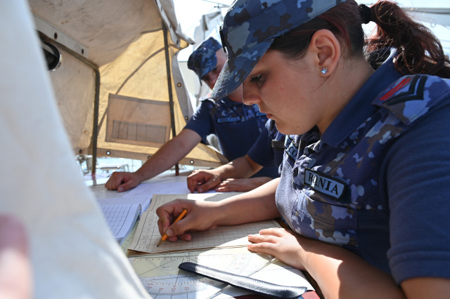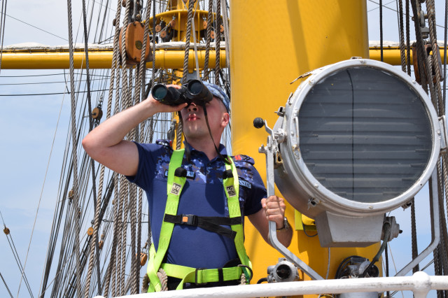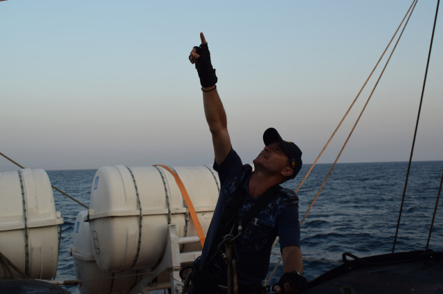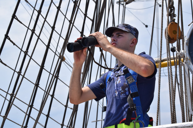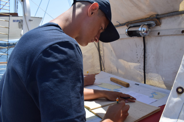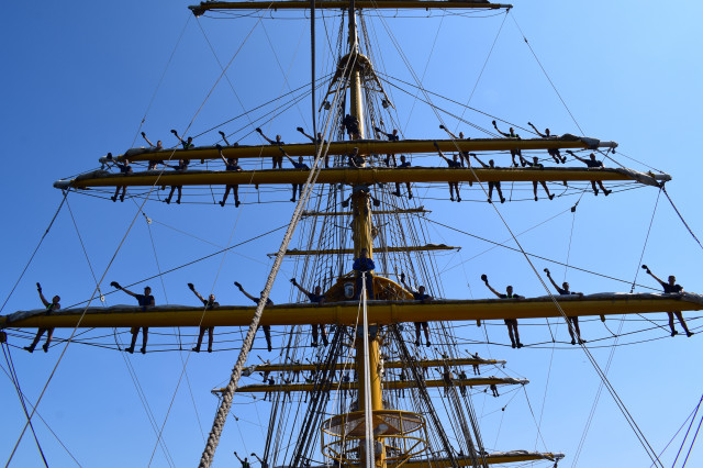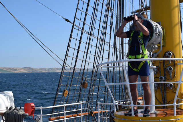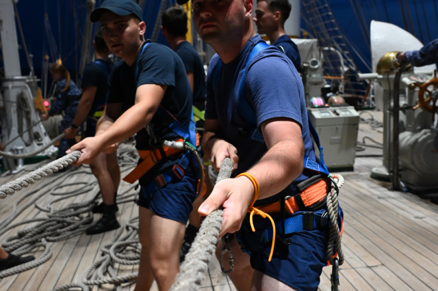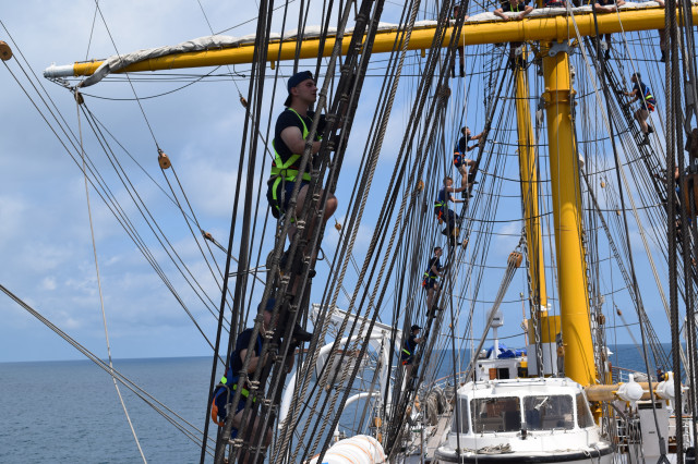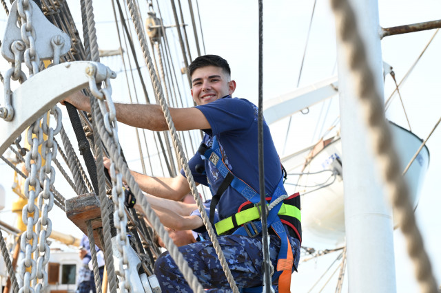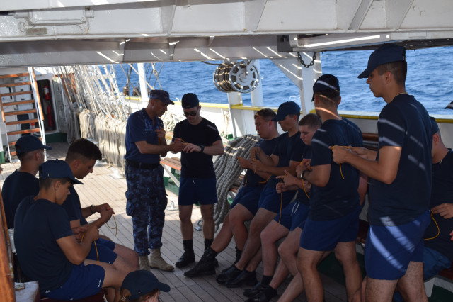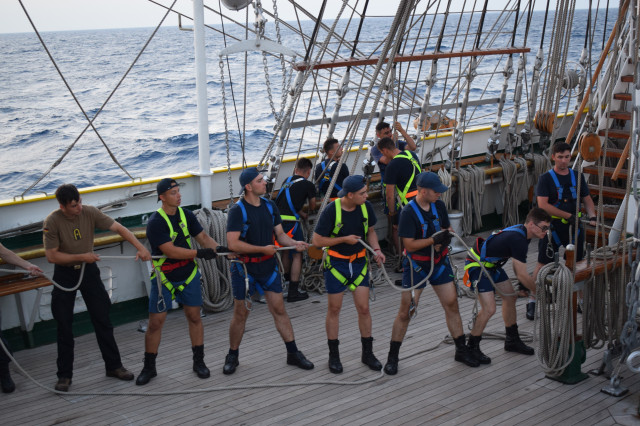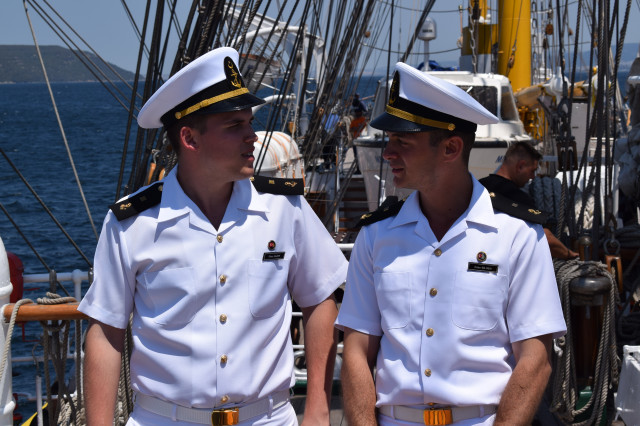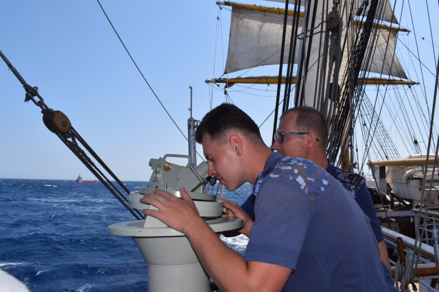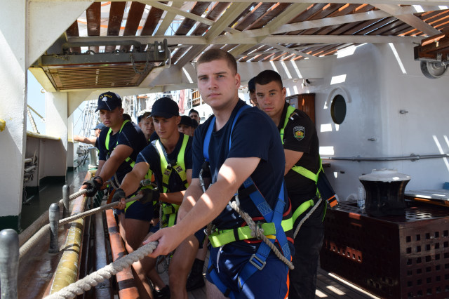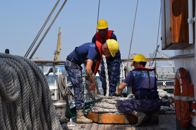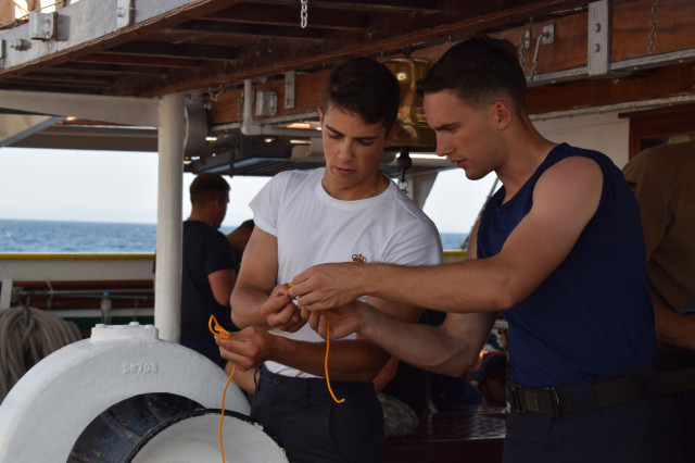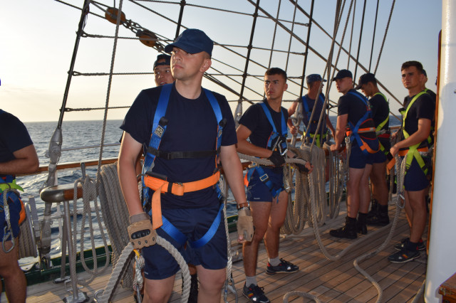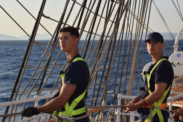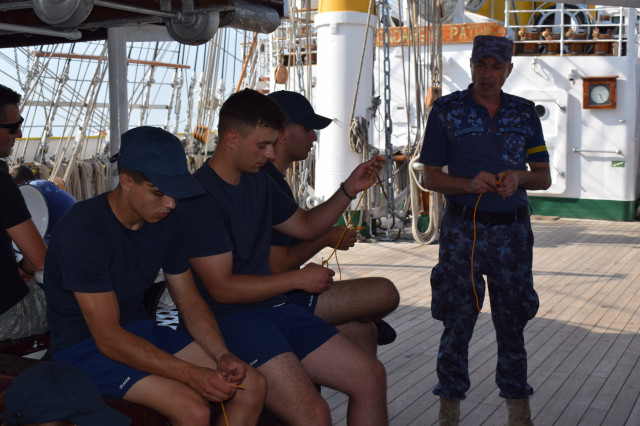 Vremea ține din plin cu echipajul, astfel încât și militarii de la serviciul de luptă vele au ocazia să parcurgă noi etape cu studenții. Mai întâi, cadeții avansează un nivel în arboradă și exersează trecerea prin crucetă. Indicatorul că se descurcă excelent este faptul că instrutorii iau decizia de a-i desfășura pe vergi pentru prima dată în acest marș de instrucție. Cu emoții, după cum este și firesc, dar și cu multă curiozitate, studenții aleși după aptitudinile fizice, pășesc încet, dar sigur, pe țapapie, ghidați de jos, de aspiratul Mihai Alexandru și de maistrul militar clasa a II-a Gabriel Tomița și susținuți, de sus, din arboradă, de militarii de la SL vele. Astfel, până la intrarea în Bosfor, studenții militari, români și străini, au bifat deja, cu succes, două dintre obiectivele de practică.