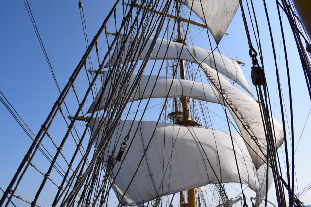 La două zile de la plecarea din Constanța, după traversarea celor două strâmtori turcești, Bosfor și Dardanele, Marea Egee ne întâmpină cu cel mai bun vânt pentru navigația cu vele, cel din pupa tribord. Comandantul navei, comandorul Mircea Târhoacă, ia decizia de a întindele vele, lansând, în același timp, o nouă provocare studenților. Pentru următoarele două zile, din Turcia până aproape de prima noastră destinație, portul elen Pireu, vom naviga cu vele. Cadeții, împreună cu militarii de la SL vele, întind 11 dintre cele 23 de vele: focul 2, focul 4, velele gabier de la farul prova și de farul pupa, velele contragabier, vela mare, vela straiul mare, straiul randei, straiul zburător artimon și straiul zburător mare.