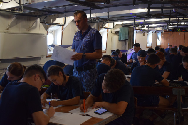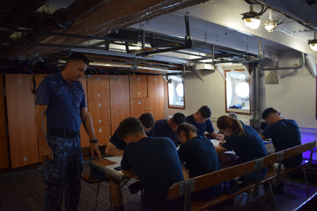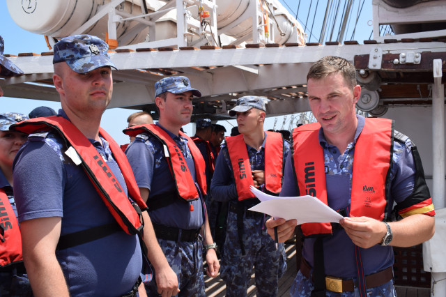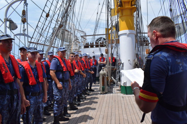 Activitățile de instruire menite să ascută simțurile tinerilor lupi de mare debutează cu desemnarea rolurilor în cazul necesității abandonului navei. Sub comanda secundului, căpitanul Robert Molodeț, întregul echipaj de adună la puntea centru, echipat cu vestele de salvare. Studenții militari stau așezați în formație și ascultă cu multă atenție explicațiile oferite de ofițerul care conduce activitatea. Primii sunt desemnați șefii de plute, se dă citire listelor cu repartiția pe plute, iar, în liniște și remarcabilă organizare, atât membrii echipajului, cât și studenții își ocupă locurile în zonele desemnate de la puntea centru. Deși pentru studenții militari este primul exercițiu de acest gen, ei dau dovadă de tenacitate și de un simț al orientării foarte bine dezvoltat. La finalul activității, secundul îi felicită pentru implicare și îi încurajează să mențină același tonus și la activitățile care vor urma.