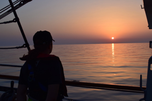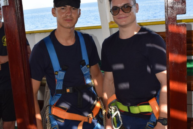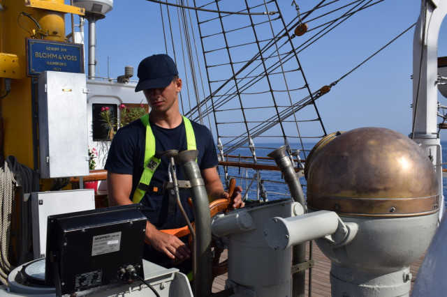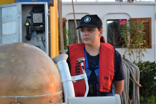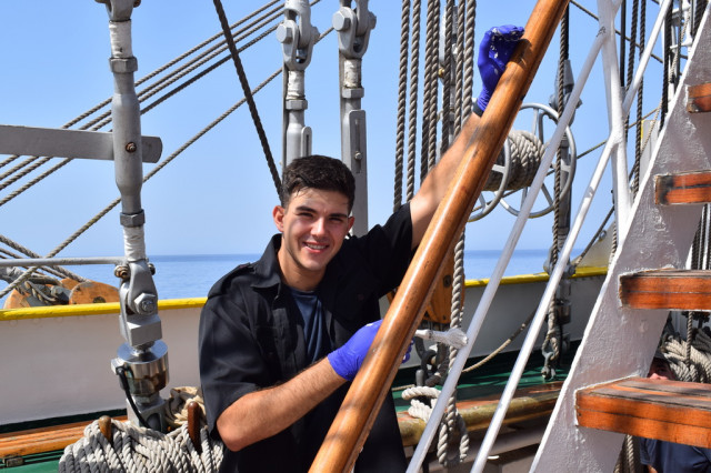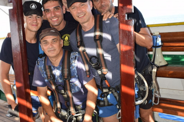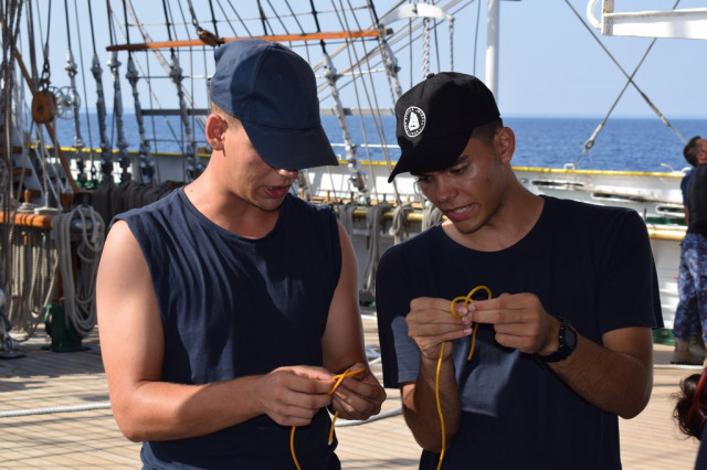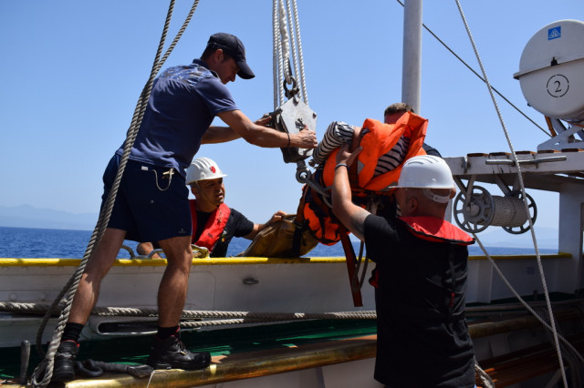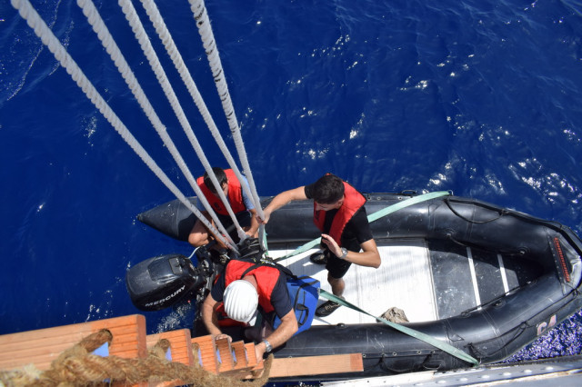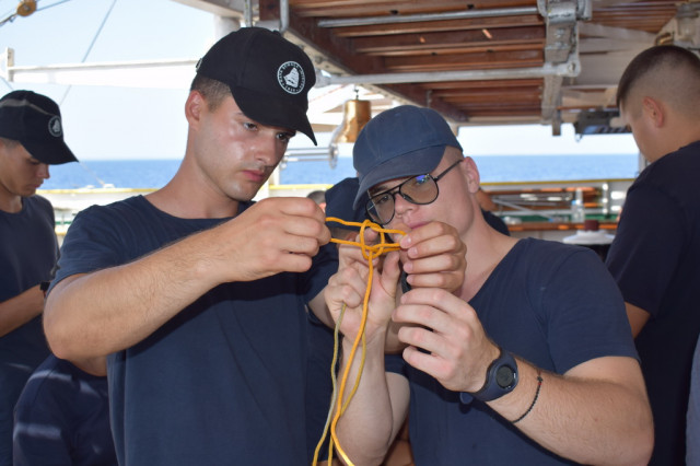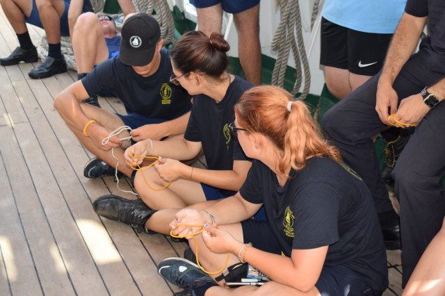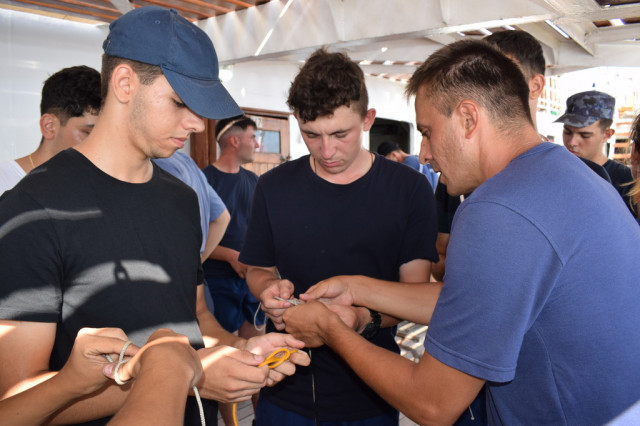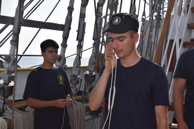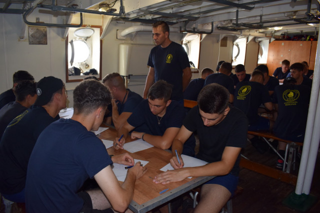 După masa de dimineață, programul zilnic al cadeților continuă cu o nouă sesiune de antrenament cu bărcile 10+1, urmată de un mic exercițiu de abandon al navei, care dă șansa echipajului să se răcorească în apa de o limpezime perfectă a Mării Ionice.