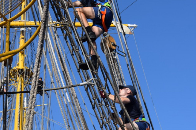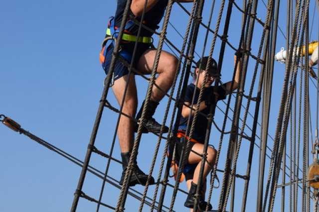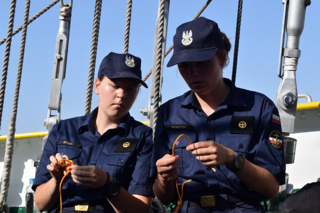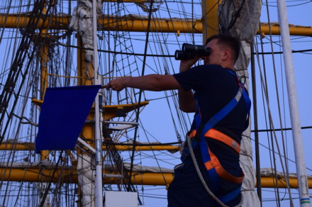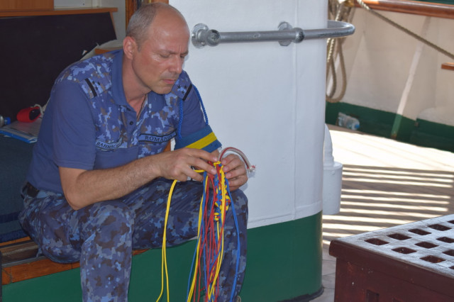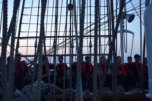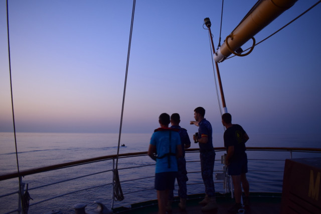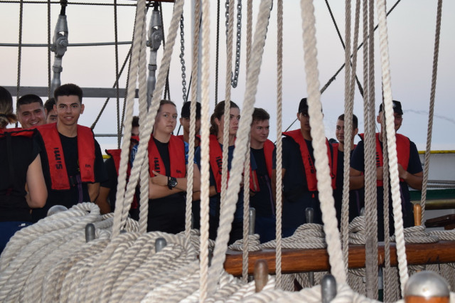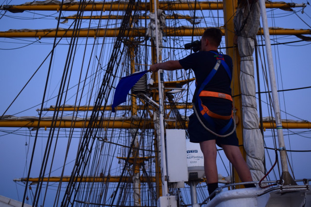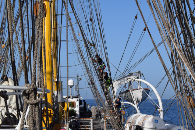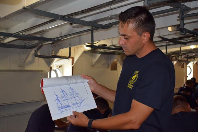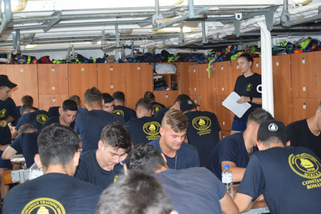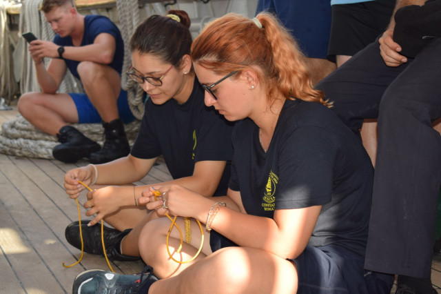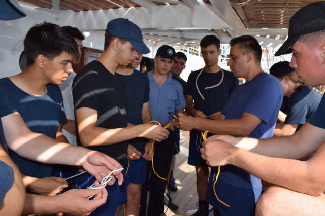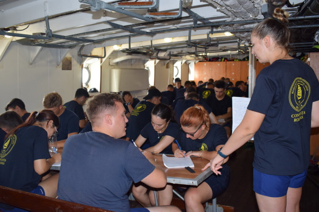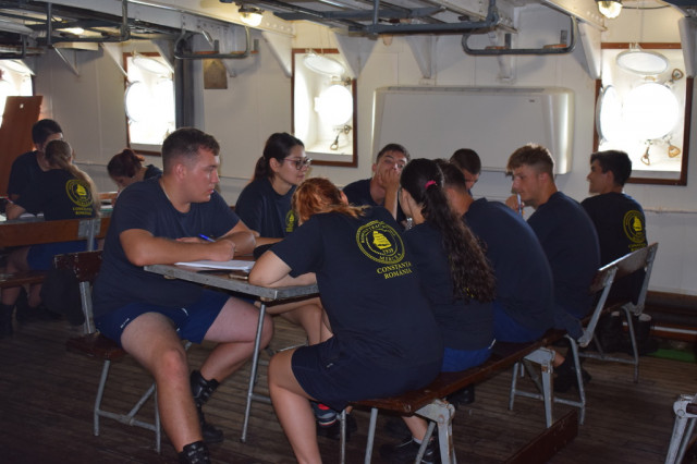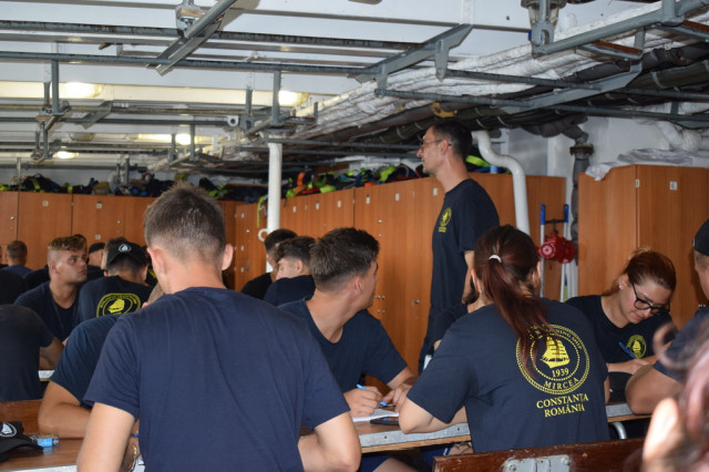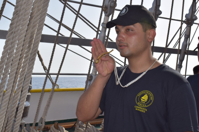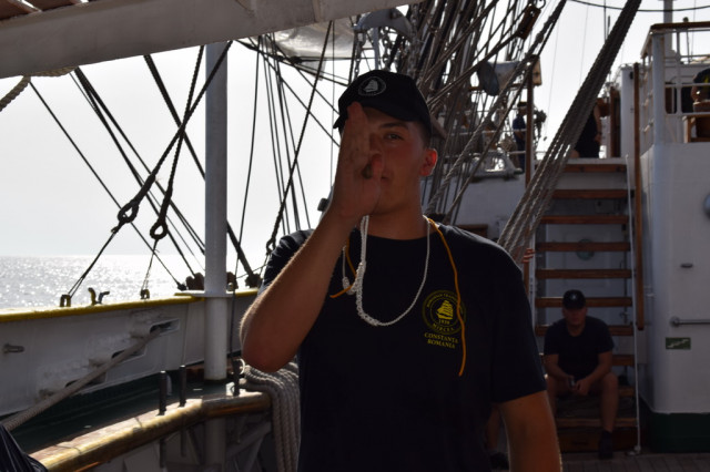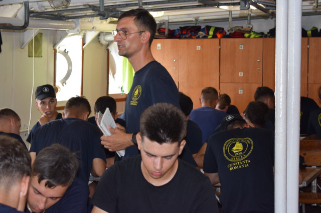 După ce zarva manevrei de ieșire din port s-a potolit, cadeții sunt adunați la puntea centru pentru comunicări de ordine. Programul zilei va cuprinde o recapitulare practică a cunoașterii navei, precum și ateliere de noduri marinărești, în timp ce soldații și gradații profesioniști dau startul retușurilor necesare pentru ca „lebăda albă” a Forțelor Navale Române să strălucească la festivitățile dedicate Zilei Marinei Române.