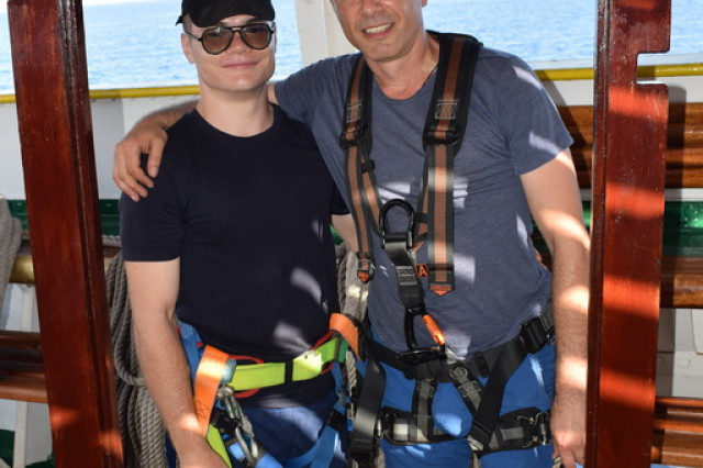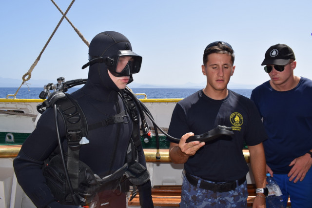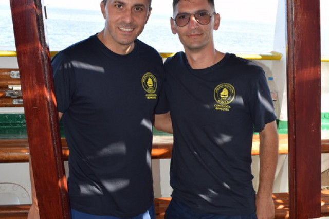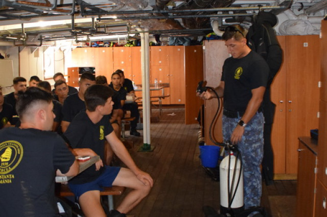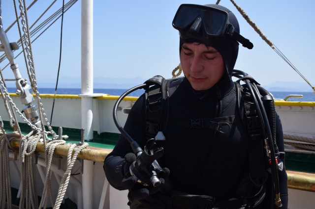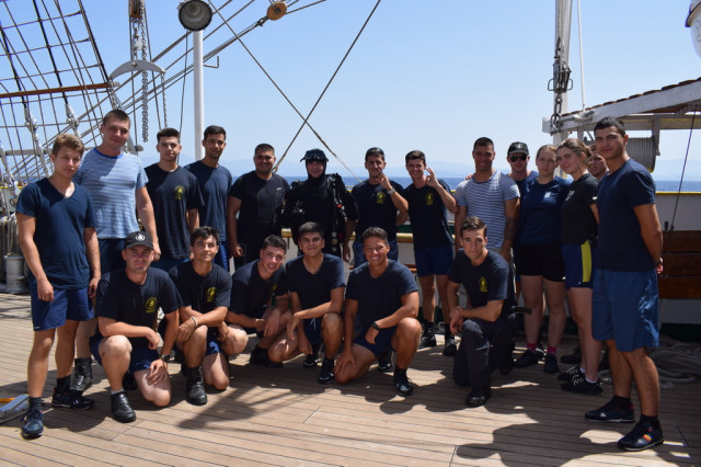 Ziua de vineri, 21 iulie, se scurge în lentoarea dictată de aceeași caniculă care nu ne dă pace nici aici, în largul mării. În calitate de lider al echipei de scafandri de la bord, aspirantul Radu Crișan le-a pregătit studenților un atelier inspirațional, am putea spune, în care să le prezinte echipamentul și specificul profesiei de scafandru. Prezentarea se desfășoară tot la adăpostul oferit de cazarma trei, unde studenții ascultă cu interes real discursul aspirantului Crișan și profită de fiecare pauză între fraze pentru a strecura câte o întrebare. Reeditând momentul în care el însuși a îmbrăcat pentru prima oară, din curiozitate, costumul de neopren al scafandrilor, pe bricul „Mircea”, în marșul de instrucție din 2019, aspirantul Radu Crișan caută doritori să preia ștafeta. Desigur, numărul mâinilor ridicate este disproporțional cu numărul de costume disponibile pentru a fi încercate. Sunt aleși doi voluntari pe care scafandrii îi ajută să se echipeze și să iasă pe punte.