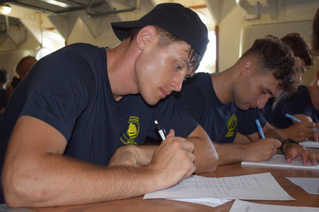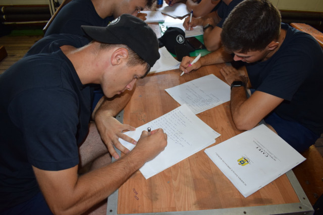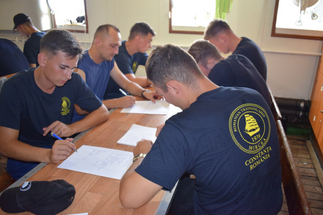 În fața foilor de examen, cadeții sunt relaxați. De la plecarea din Constanța au avut timp suficient să colinde nava în lung și-n lat, de la prova la pupa, s-o observe, în amănunt, de la chilă la măr, au luat parte la patrule de siguranță cu vitalistul de serviciu, au făcut carturi de veghe, curier, timonier și la navigație, astfel încât prea puțini sunt cei care s-ar putea văita că n-au „căzut” pe subiect.