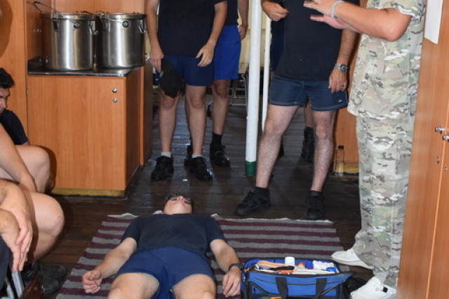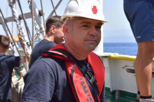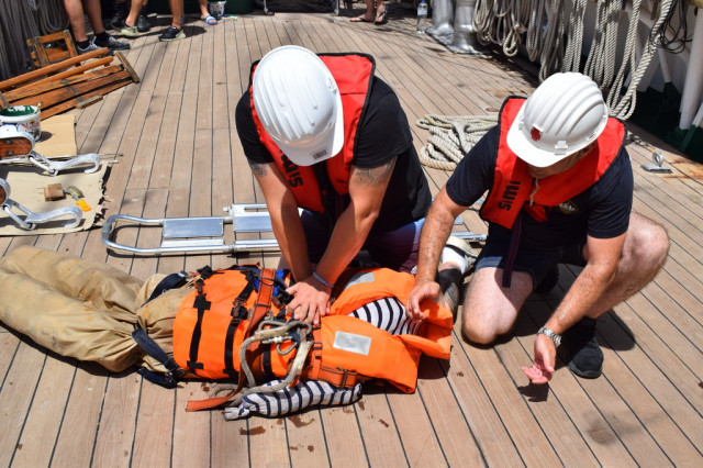 La puntea centru se desfășoară activități de mentenanță, însă, dintr-o dată, un zgomot mai puțin cunoscut ia în stăpânire atmosfera. În timp ce studenții se uită mirați în jur, grupa de vitalitate intră in alertă: „Om la apă!” Îngrijorarea crește, iar toți cei prezenți pe punte se îndreaptă spre copastie pentru a vedea dacă este vorba despre un incident real sau despre o simulare. Din fericire, avem de-a face cu un exercițiu. Armamentul bombardului coboară rapid șalupa la apă, în timp ce echipa medicală se materializează instantaneu, pe punte, gata de intervenție. Timonierul execută manevra de girație, în timp ce bombardul se îndreaptă spre locul unde Oscar, manechinul ghinionist, plutește în derivă, așteptând, ca de fiecare dată, să fie salvat. Recuperată din apă, „victima” este adusă înapoi pe navă, așezată cu grijă la puntea centru, unde i se acordă primul ajutor din partea echipei medicale. Studenții sunt cu toții adunați în jurul celor doi sanitari și le studiază încercând să memoreze, fiecare mișcare: verificarea semnelor vitale, aplicarea gulerului cervical, manevra de resuscitare, după ce s-a constatat că victima a fost la un pas de înec. Exercițiul se încheie cu ieșirea din scenă a manechinului cu tricou vărgat, cărat pe targă, spre infirmerie.