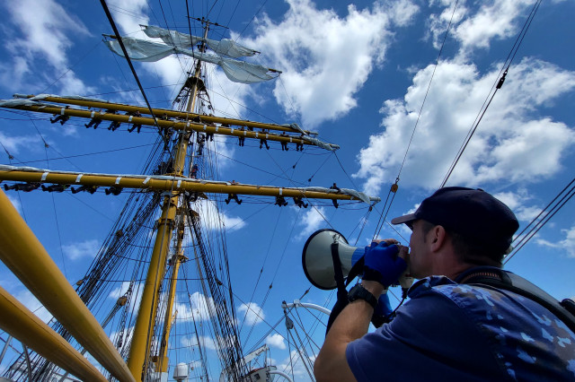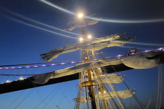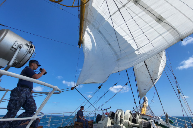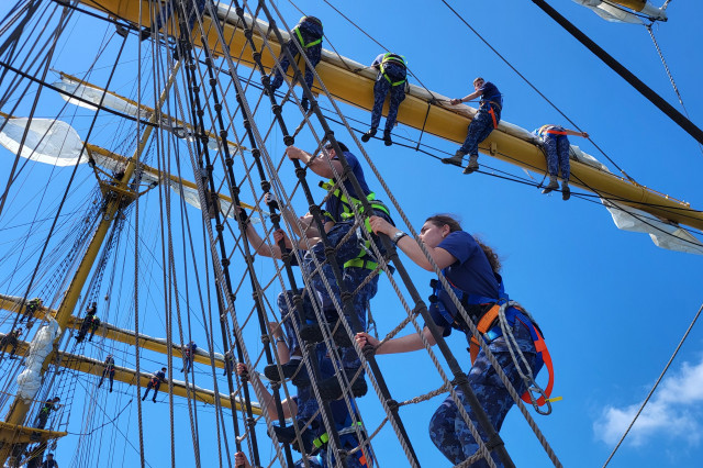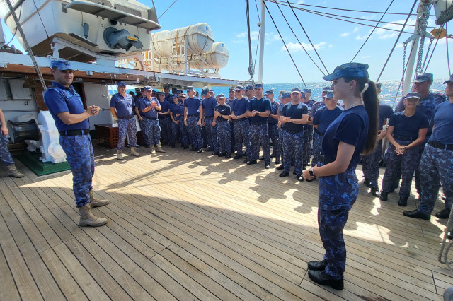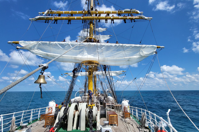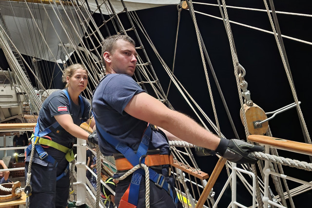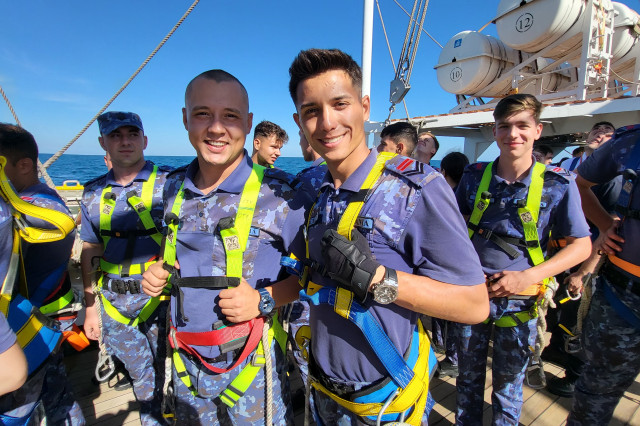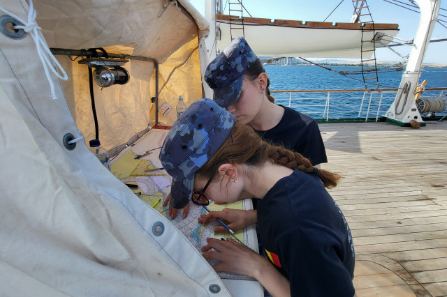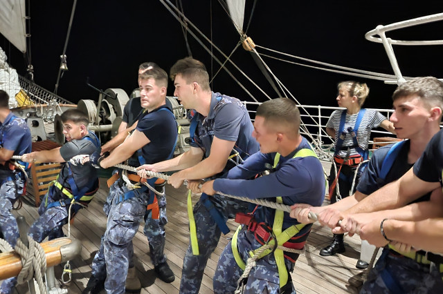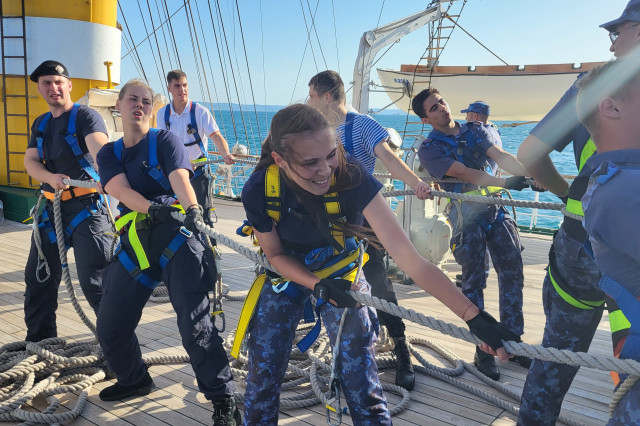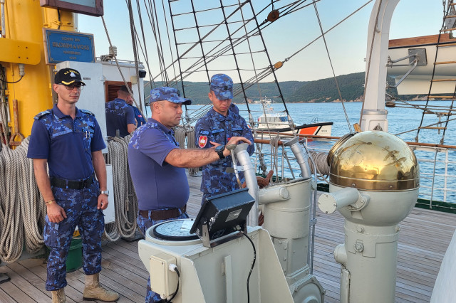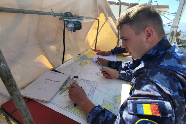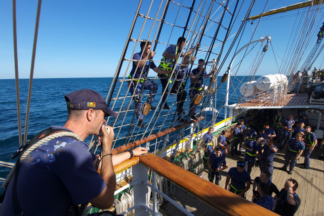 Lucrul în arboradă s-a desfăşurat sub conducerea căpitanului Ştefan Scutelnicu, comandantul serviciului vele, şi a maistrului militar clasa I Gabriel Tomiţă, care este şi şeful de echipaj pentru acest marş de instrucţie. Ultimul ne-a precizat: „A fost un început de marş mai «furtunos», vântul ne-a pus puţin în dificultate, dar ne străduim să-i facem faţă. Am navigat cu vele apoi le-am strâns, pe etape şi momente, când marea ne permitea, pentru că deja nava era bandată şi nu vrem să cedeze vreo parâmă care să ne îngreuneze strângerea lor ulterior. Am avut o noapte aproape albă, toţi marinarii de la serviciul de luptă navigaţie vele, dar şi toţi cadeţii de la Academia Navală „Mircea cel Bătrân” care s-au acomodat foarte bine. Vreau să subliniez că sunt încântat de modul în care se prezintă această generaţie, am văzut un progres real în doar câteva zile de la plecarea noastră.” Şi dacă vă întrebaţi ce mai fac studenţii cu puţinul timp liber rămas după lucrul în arboradă, să ştiţi că au mai făcut şi cunoaşterea navei (la propriu şi esenţială pentru practica lor), vitalitate sau exerciţii de abandon al navei. Anul acesta cei 86 de studenţi români studiază la cinci specializări: navigaţie (în limba română și engleză), electromecanică, inginerie electrică şi logistică militară. Şi după cum ne mărturisea locotenent-comandorul Octavian Volintiru, şeful practicii, sunt o generaţie foarte bună. Despre ce o să se întâmple în Pireu o să aflaţi din corespondenţa viitoare.