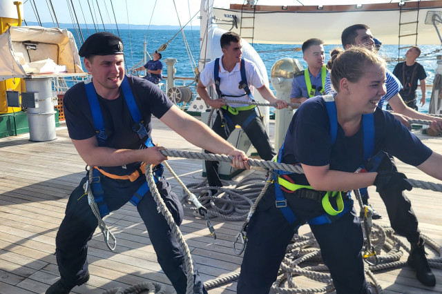 În după-amiaza plecării deja erau în arboradă pentru antrenamente, treceau prin crucetă şi se desfăşurau pe vergi în timp ce dragorul maritim 30 „Sublocotenent Alexandru Axente” deschidea drumul în faţa noastră. Pentru cei opt cadeţi străini din Bulgaria, Polonia, Letonia, Spania şi Turcia prezenți la bord, a fost categoric prima experiență de acest fel, au urcat toţi în echipe mixte sub atenta îndrumare a instructorilor. Ekaterini Penkova din Bulgaria a atras atenţia instructorilor, determinată şi agilă. Studenta este la a doua experienţă românească. Ea a mai studiat la Academia Navală „Mircea cel Bătrân” prin programul Erasmus militar şi a dorit să fie prezentă şi în acest marş de instrucţie. În a doua zi a marşului, tot în Marea Neagră, au fost întinse 18 din cele 23 de vele ale N.Ş. Mircea, velierul Academiei Navale „Mircea cel Bătrân”. Nu este fără precedent, dar este reconfortant să reuşeşti întinderea velelor cu aceşti cadeţi minunaţi aflaţi la începutul marşului la doar o zi de la plecarea din Constanţa.