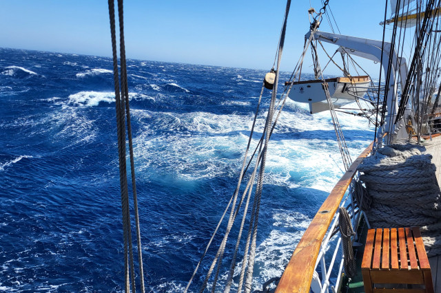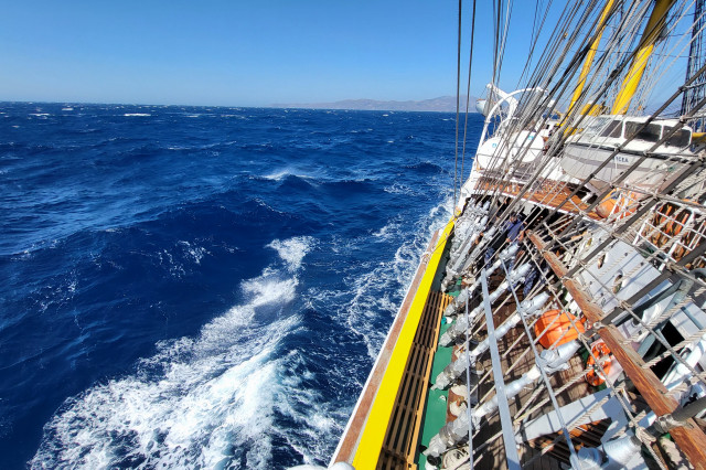 După întinderea velelor din timpul nopţii precedente la ieşirea din Strâmtoarea Dardanele (Çanakkale) am navigat până spre amiază cu toate cele şase vele de pe cele două faruri (vela mare, gabierul, contragabierul) cu vânt favorabil spre sud. Am navigat pe o Mare Egee mai învolburată, aşa cum este adesea în lunile mai sau iunie, bine bandaţi la babord, cu repetate braţări (reorientarea vergilor în funcție de direcţia vântului şi a navei), pentru a ne urma drumul nostru spre Pireu. Momentele „spumoase”, la propriu, au fost în şi la ieşirea din Strâmtoarea Kafirea, unde, fără a fi furtună, gradul mării a ajuns la 4 spre 5, puterea vântului la 6-7, cu 21 de metri pe secundă, iar bătrânul nostru velier a luat şi benzi de 23 de grade (înclinarea navei faţă de axul longitudinal). Fără probleme pentru navă şi echipaj, pentru cadeţi mai ales, care au trudit din greu în ultimele două zile în arboradă, chiar dacă răul de mare şi-a făcut apariţia.
