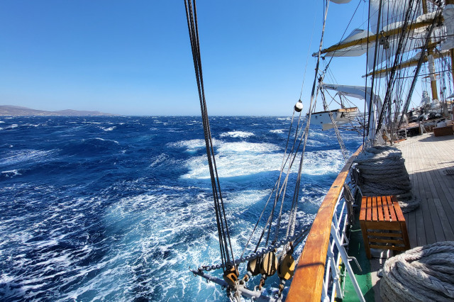 Marea Egee ne-a întâmpinat nu doar cu albastrul ei incredibil, dar şi puţin furtunoasă, cu vânt cam tare, dar favorabil, așa că s-a decis desfăşurarea velelor. Întinderea velelor începută seara s-a terminat târziu în noapte, la lumina reflectoarelor, vântul puternic îngreunând totul. Şi astfel am mai reuşit ceva, să facem navigaţie cu vele pe timp de noapte în arhipelagul grecesc, la doar trei zile de la plecarea din Constanţa.