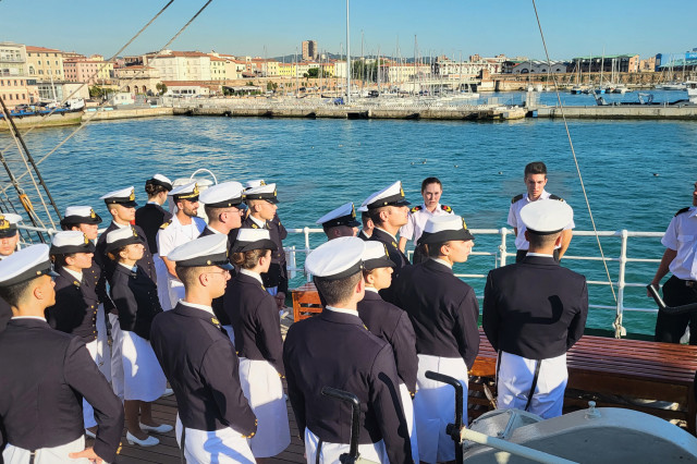 După şase zile şi 900 de mile parcurse, în dimineața zilei de miercuri, 10 iulie, acostam la cheul portului Livorno, prima nostră escală italiană din marşul de instrucție al Navei-Școală „Mircea” din acest an. Doar două zile am rămas aici pentru refacerea plinurilor de alimente şi apă. Un alt obiectiv al escalei noastre a fost, desigur, și întărirea legăturilor dintre Academia Navală „Mircea cel Bătrân” şi Academia Navală italiană de aici, din Livorno, fondată în 1881 în urma reunirii celor două şcoli de marină deja existente de la Genova şi Napoli.