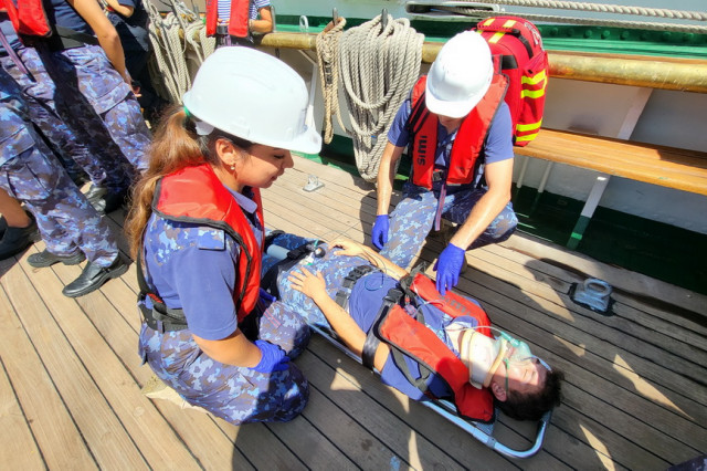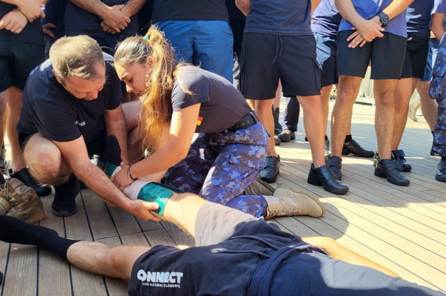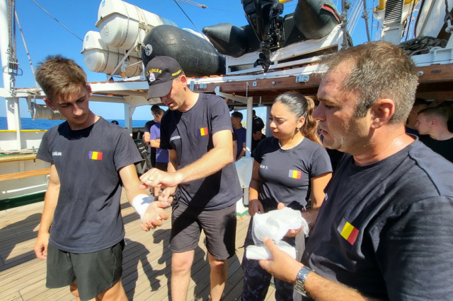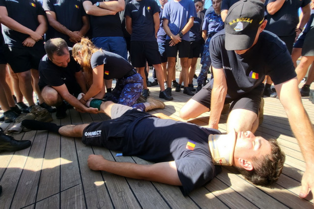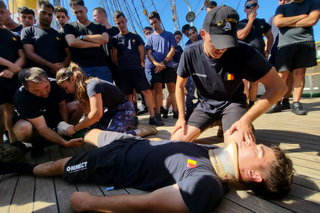 Pe lângă exercițiile de vitalitate, în această etapă a marșului a fost organizată şi ceea ce putem numi „instrucţia sanitară” pentru studenţii Academiei Navale „Mircea cel Bătrân”. În cadrul ei, cadeții au învățat noţiuni elementare de acordare a primului ajutor. Echipa medicală de la bord este formată din colonelul medic Eduard Moise şi doi subofiţeri sanitari. La puntea centru a navei, aceștia le-au arătat studenţilor cum se acordă primul ajutor.