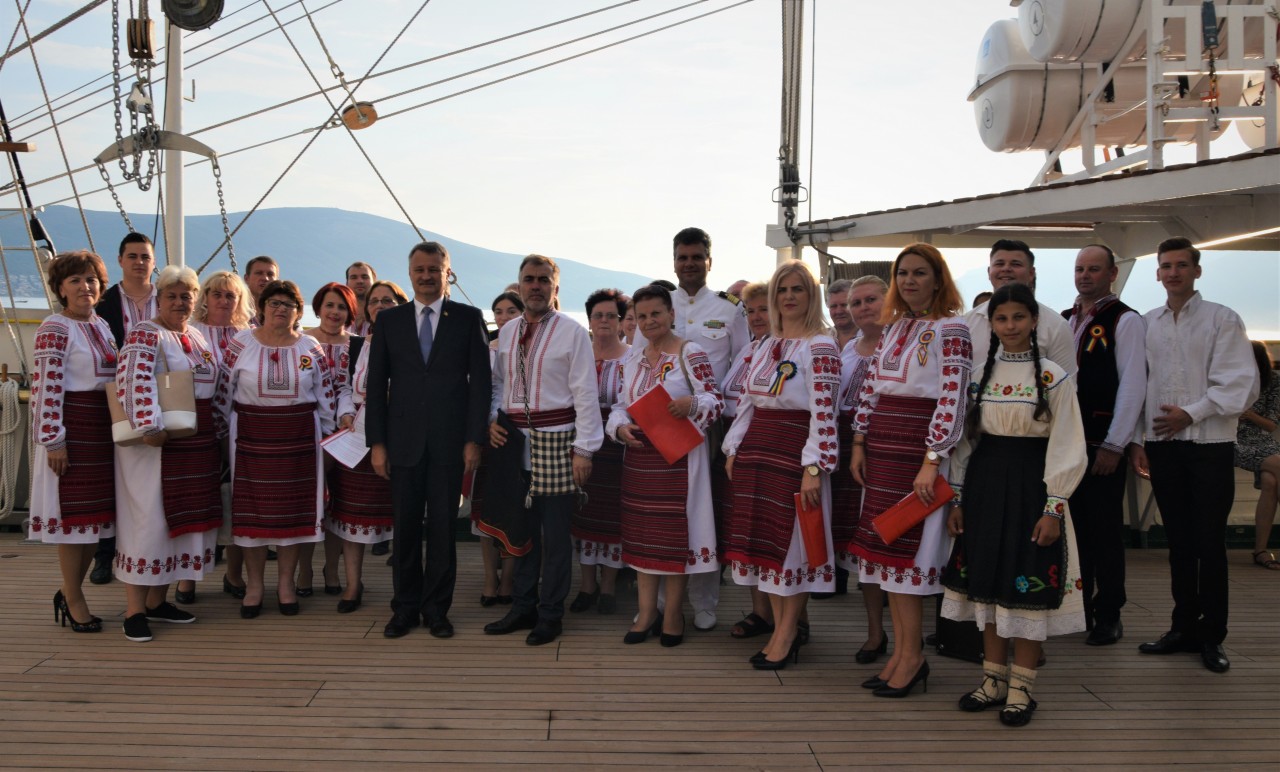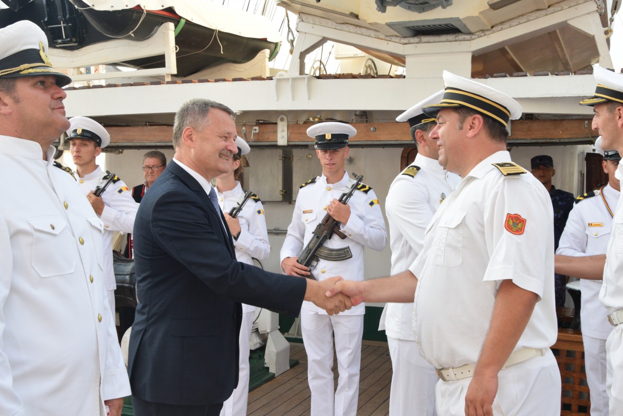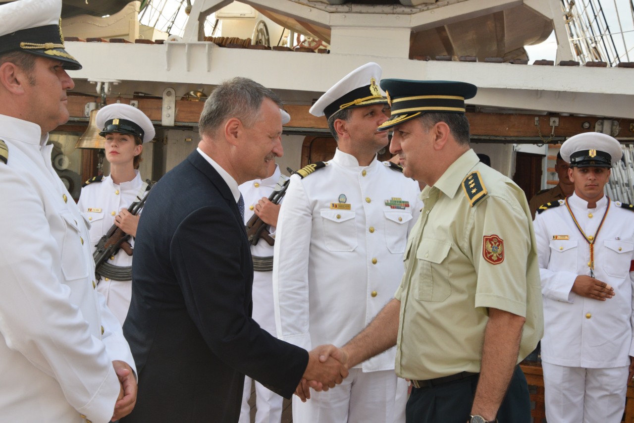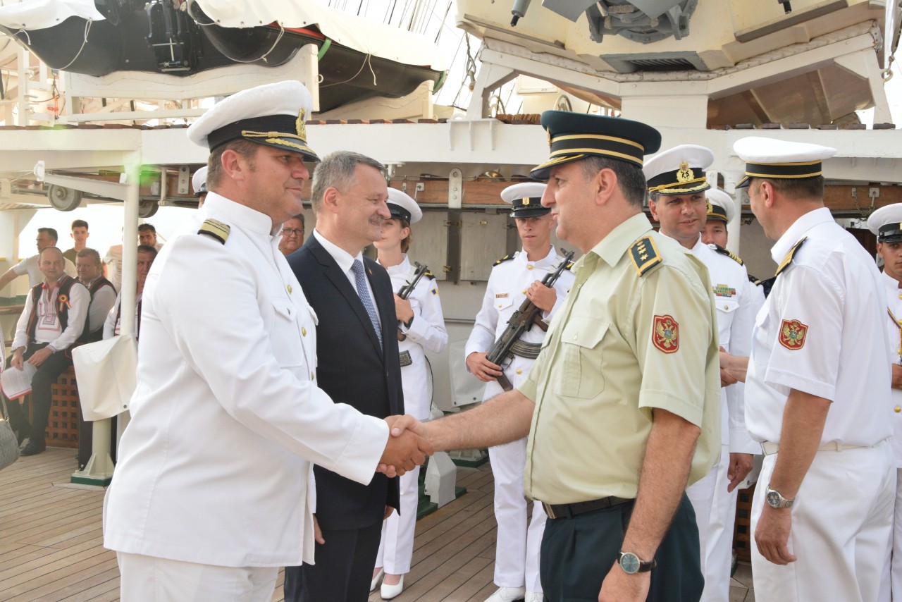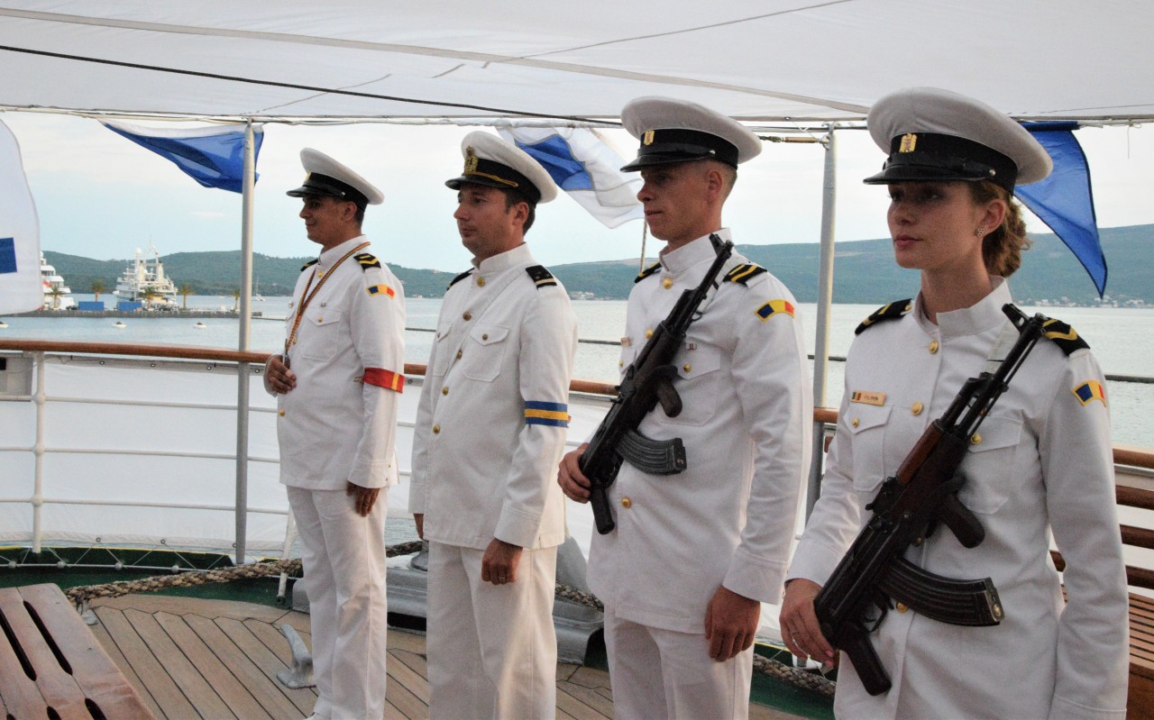Astfel, în cel de-al doilea port al călătoriei noastre, am fost așteptați ca de obicei de oficialitățile române din teritoriu, pe care cadeții noștri le-au salutat marinărește din înaltul catargelor. „Am lăsat ancora la apă”, iar nava noastră a devenit în acea zi gazda reprezentanților celor mai importante instituții din zonă, dar și a fraților noștri de acasă, care, la invitația Eminenței Sale domnul Ferdinand Nagy, Ambasadorul României la Podgorița, au venit pentru a ne cânta românește spre bucuria tuturor.