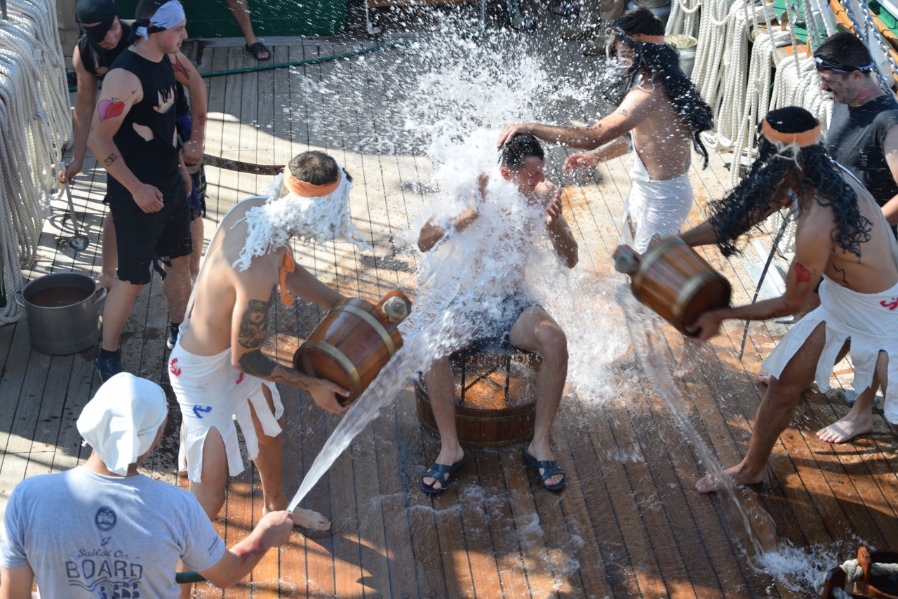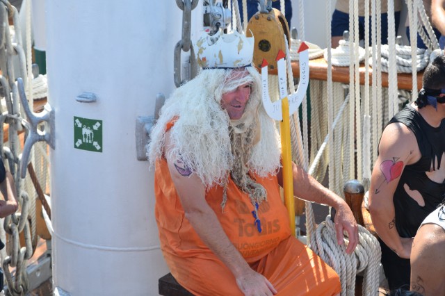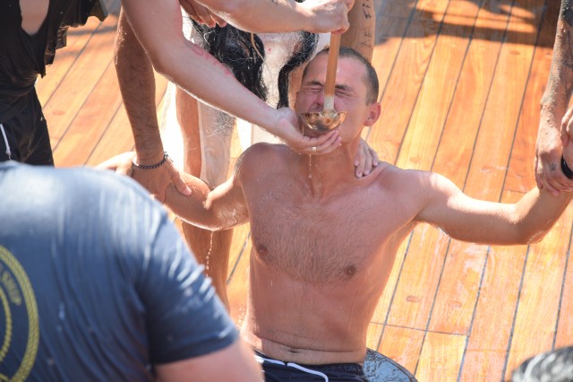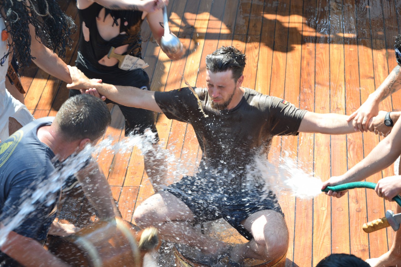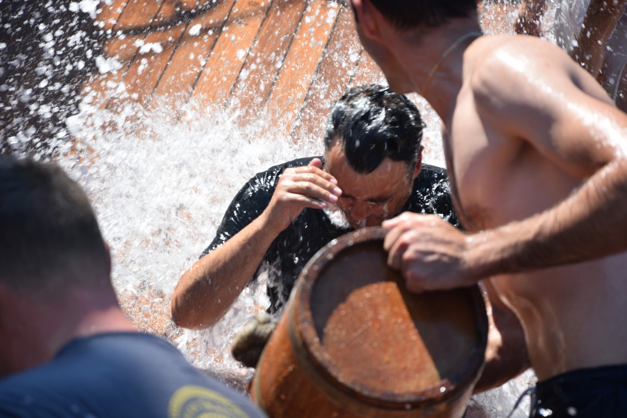 Un alt zeu și-a făcut simțită prezența la bord, Zeul Neptun, care, după atâta timp petrecut de noi toți pe mare, și-a dat acordul pentru botezarea celor care au simțit pentru prima dată ceea ce înseamnă viața de marinar. Așadar, la puntea centru, emoțiile și zâmbetele s-au arătat din nou, iar ceremonia botezului a avut loc pentru a ne întoarce cu toții adevărați oameni ai mărilor și oceanelor.
