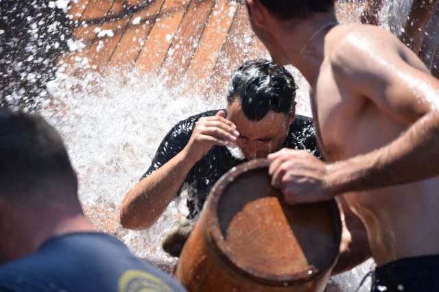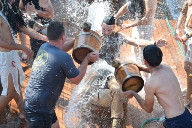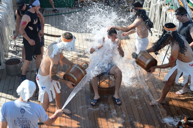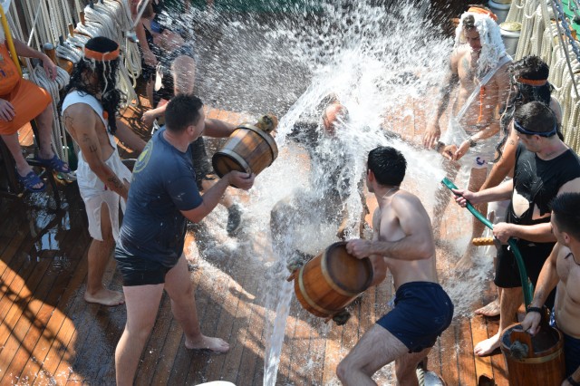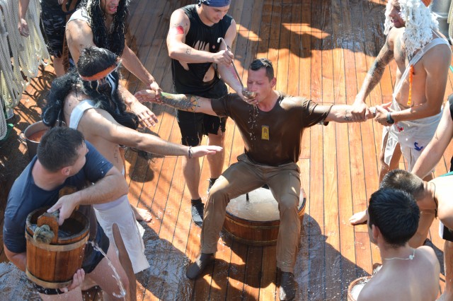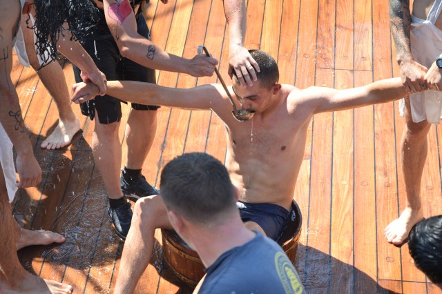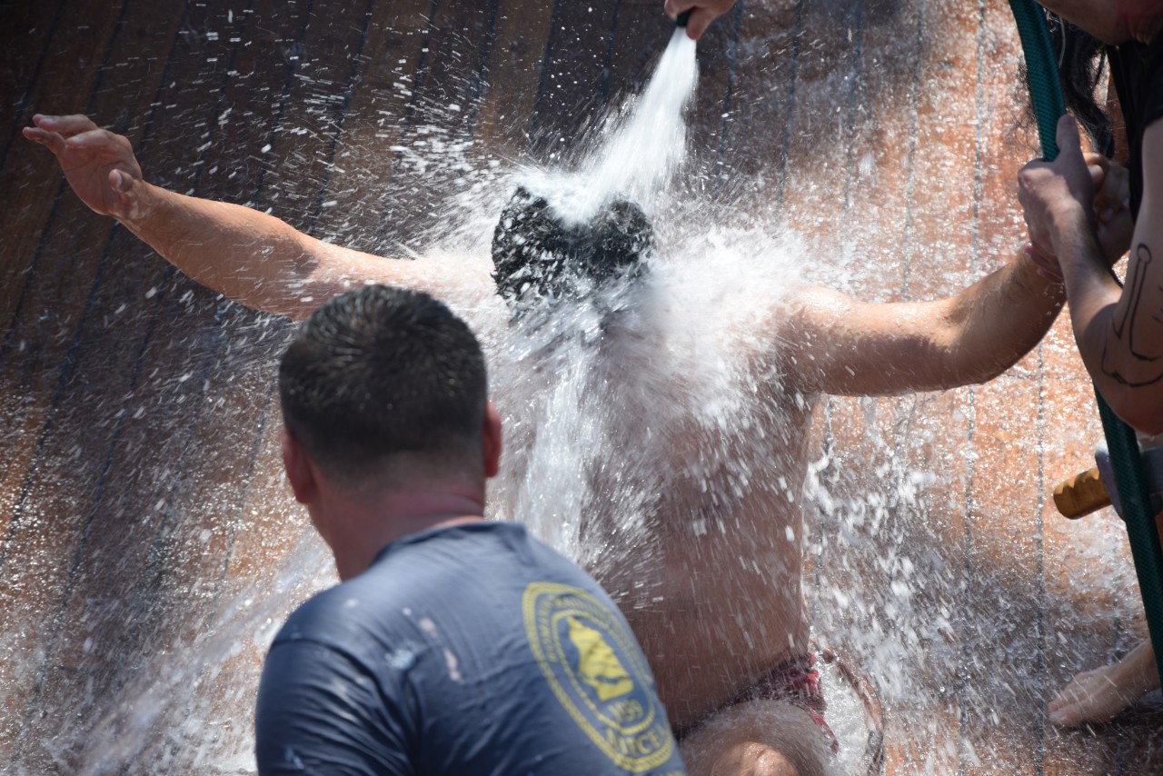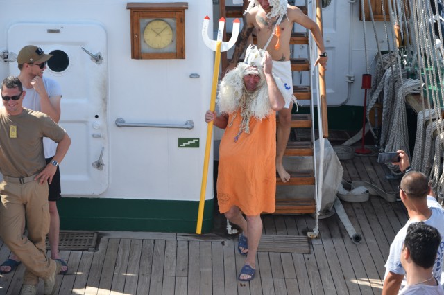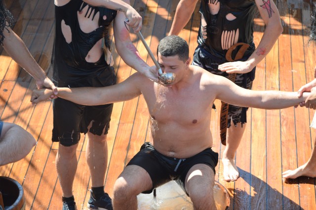 Un alt zeu și-a făcut simțită prezența la bord, Zeul Neptun, care, după atâta timp petrecut de noi toți pe mare, și-a dat acordul pentru botezarea celor care au simțit pentru prima dată ceea ce înseamnă viața de marinar. Așadar, la puntea centru, emoțiile și zâmbetele s-au arătat din nou, iar ceremonia botezului a avut loc pentru a ne întoarce cu toții adevărați oameni ai mărilor și oceanelor.