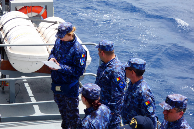 Programul zilnic la bordul navei a inclus, totodată, și o gamă largă de activități de instruire, destinate menținerii nivelului ridicat de pregătire al echipajului. Astfel, marinarii militari și-au consolidat deprinderile specifice prin executarea, în mod sistematic, a exercițiilor de abandon și de vitalitate a navei, a antrenamentelor de comunicații, a instruirii privind acordarea primului ajutor, a exercițiilor de respingere a unui atac inamic și a zborurilor de monitorizare a traficului maritim cu elicopterul Puma Naval ambarcat.