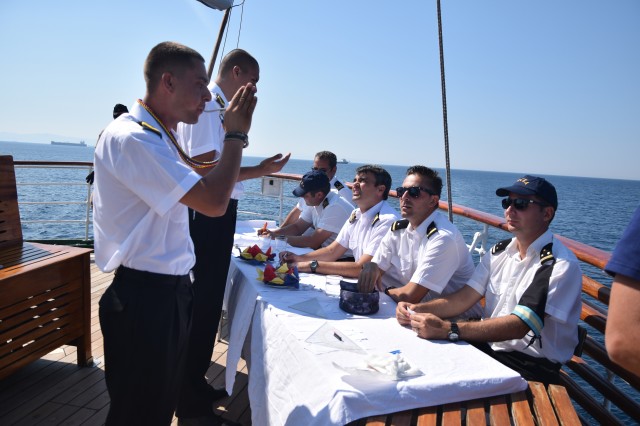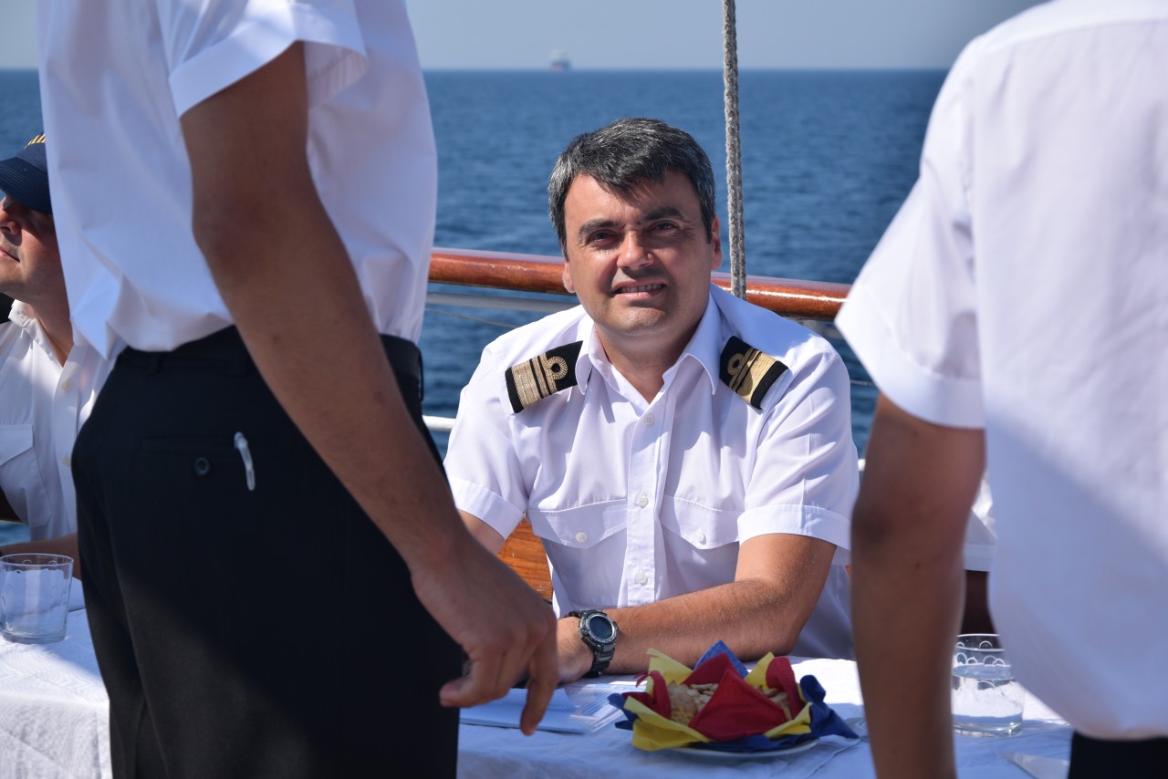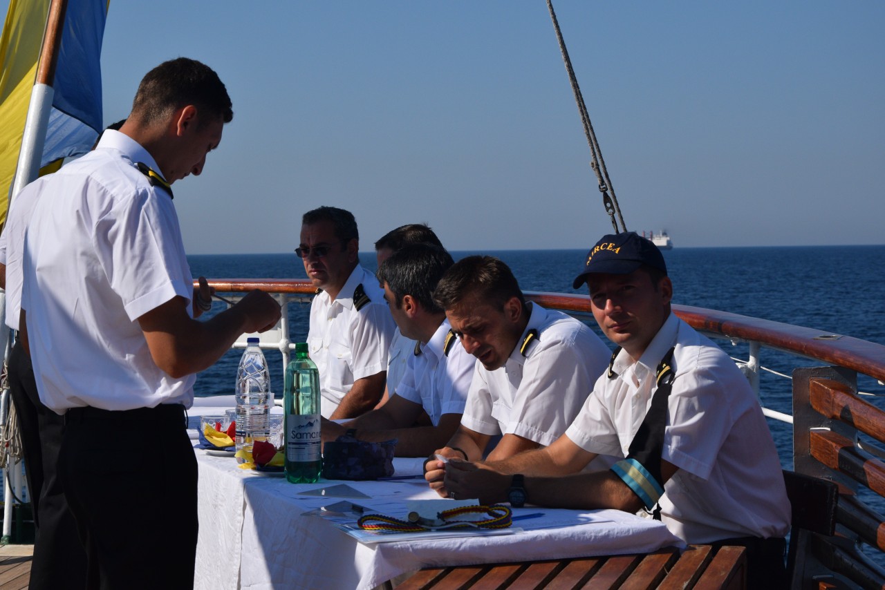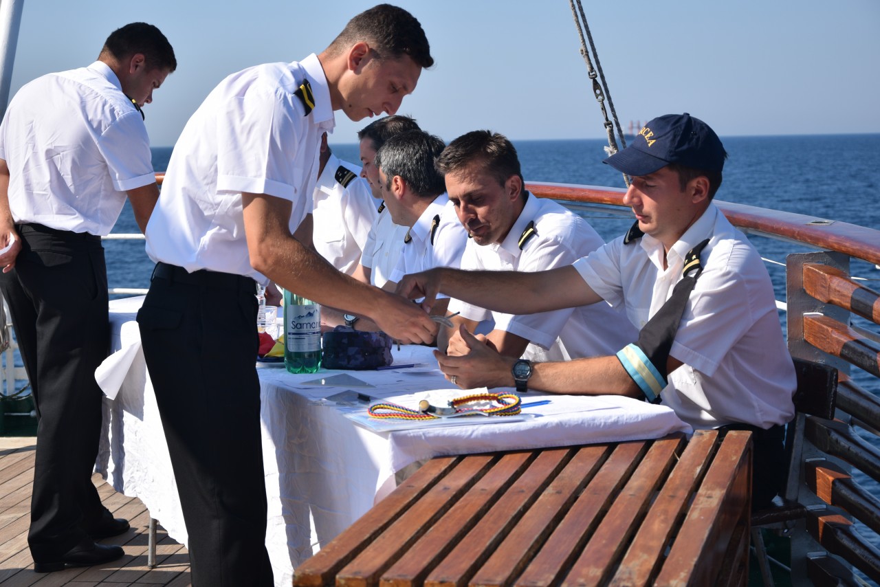 Un alt zeu și-a făcut simțită prezența la bord, Zeul Neptun, care, după atâta timp petrecut de noi toți pe mare, și-a dat acordul pentru botezarea celor care au simțit pentru prima dată ceea ce înseamnă viața de marinar. Așadar, la puntea centru, emoțiile și zâmbetele s-au arătat din nou, iar ceremonia botezului a avut loc pentru a ne întoarce cu toții adevărați oameni ai mărilor și oceanelor.