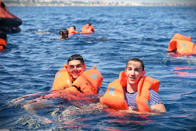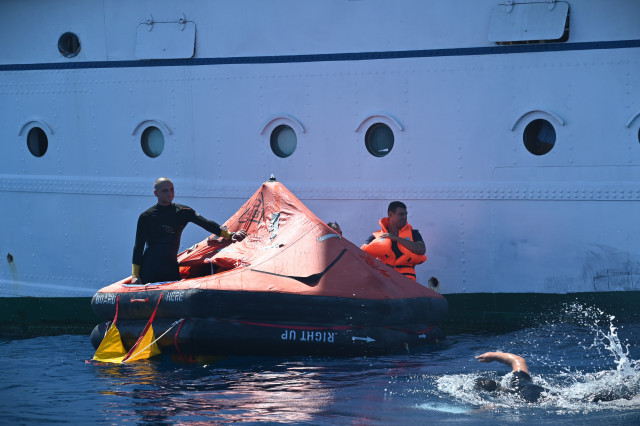 Instrucția a continuat cu un exercițiu de abandon al navei. Odată ce au auzit semnalul prin difuzoare, membrii echipajului s-au adunat la puntea centru, echipați cu veste și cu provizii la îndemână. În apă îi așteptau deja pluta de salvare pregătită, precum și scafandrii ce au vegheat asupra siguranței participanților. Exercițiul a testat viteza de reacție a studenților și a reprezentat o bună oportunitate de a verifica vigilența acestora la explicațiile primite de la instructori la începutul marșului de instrucție.