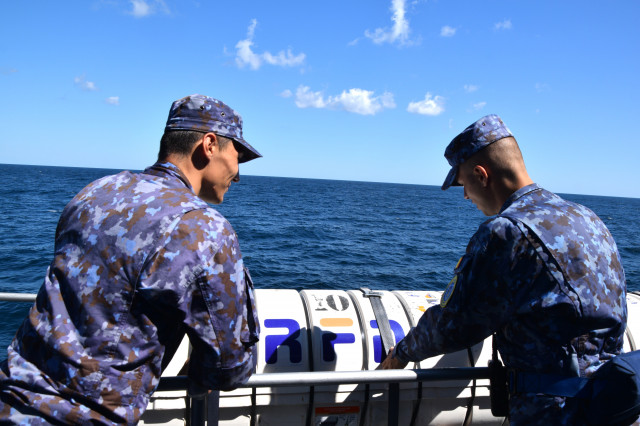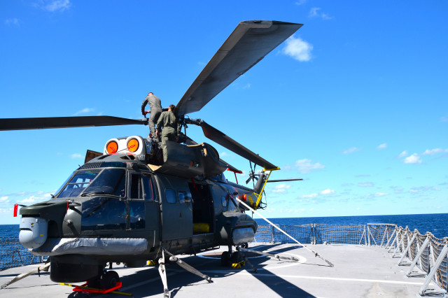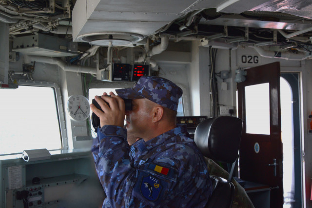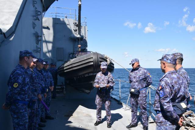 După plecarea navei din portul militar Constanța, personalul aeronautic ambarcat a executat lucrări de mentenanță a elicopterului IAR-330 Puma Naval, în vederea pregătirii acestuia pentru exploatare în mediul coroziv și salin. Ulterior, s-a desfășurat un exercițiu de antrenament pentru abandonul navei, în conformitate cu Convenția Internațională pentru Siguranța Vieții Umane pe Mare (SOLAS – International Convention for the Safety of Life at Sea). Militarii s-au prezentat la plutele de salvare repartizate, iar șeful fiecărei plute le-a transmis membrilor acesteia informațiile cu privire la rolurile pe care le au și le-a detaliat modul de utilizare a plutei și a vestei de salvare.
