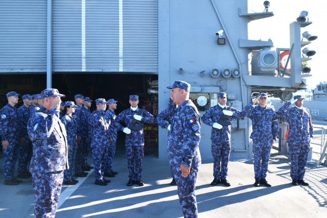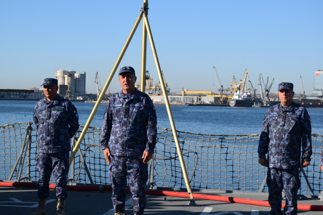 În dimineața zilei de joi, 28 august, înaintea plecării navei de la cheu, după arborarea pavilionului la pupa navei, echipajul a fost instruit cu privire la regulile, drepturile și îndatoririle pe care le au pe parcursul desfășurării operației, în conformitate cu planul de acțiune pentru misiune aprobat. La bordul navei a urcat șeful Statului Major al Forțelor Navale, viceamiral Mihai Panait, care a subliniat importanța participării navei la Operația NATO SEA GUARDIAN: „Asumarea comenzii unei grupării navale NATO reprezintă o mare responsabilitate pentru Forțele Navale Române, însă și o confirmare a încrederii pe care o au aliații noștri. Acest lucru ne onorează, însă în același timp ne și obligă să demonstrăm profesionalism și interoperabilitate. Tuturor membrilor echipajului, le doresc mult succes și misiune ușoară!”.