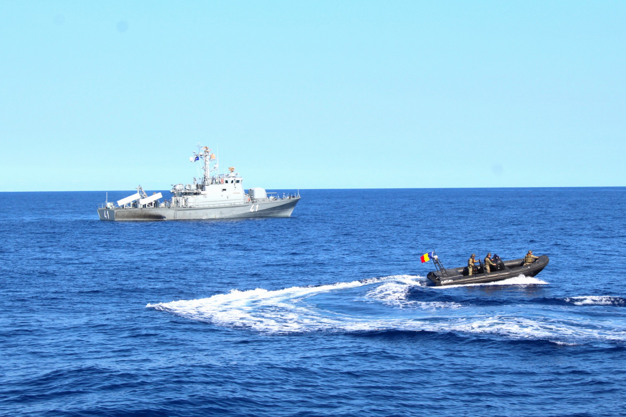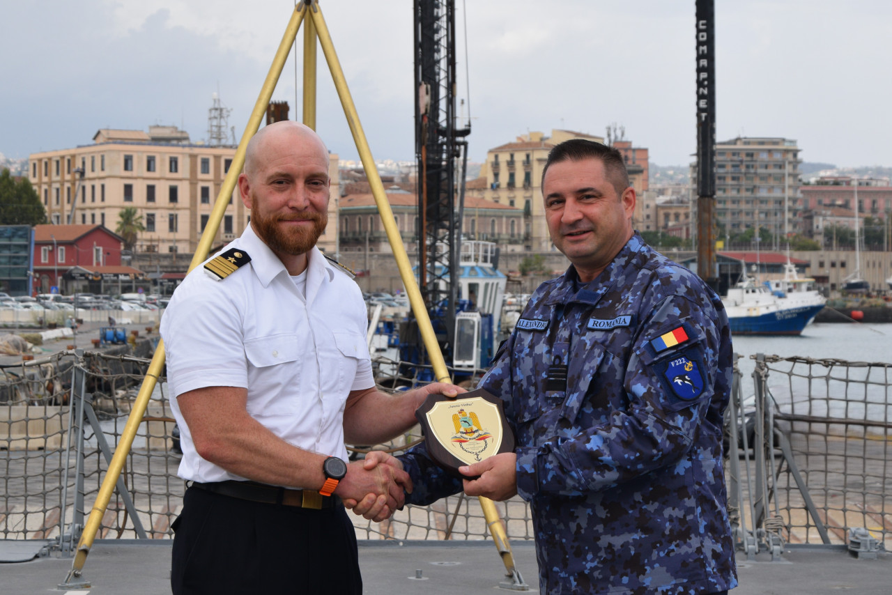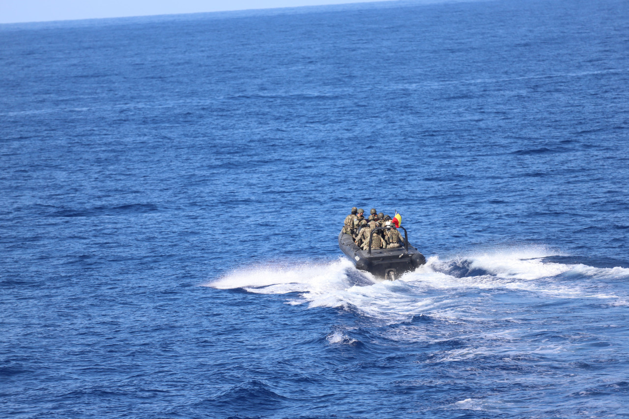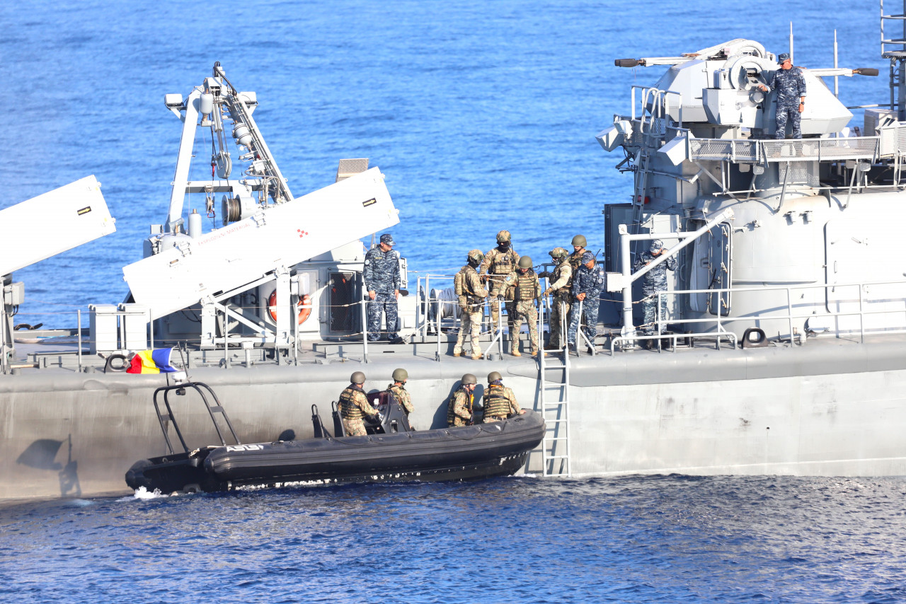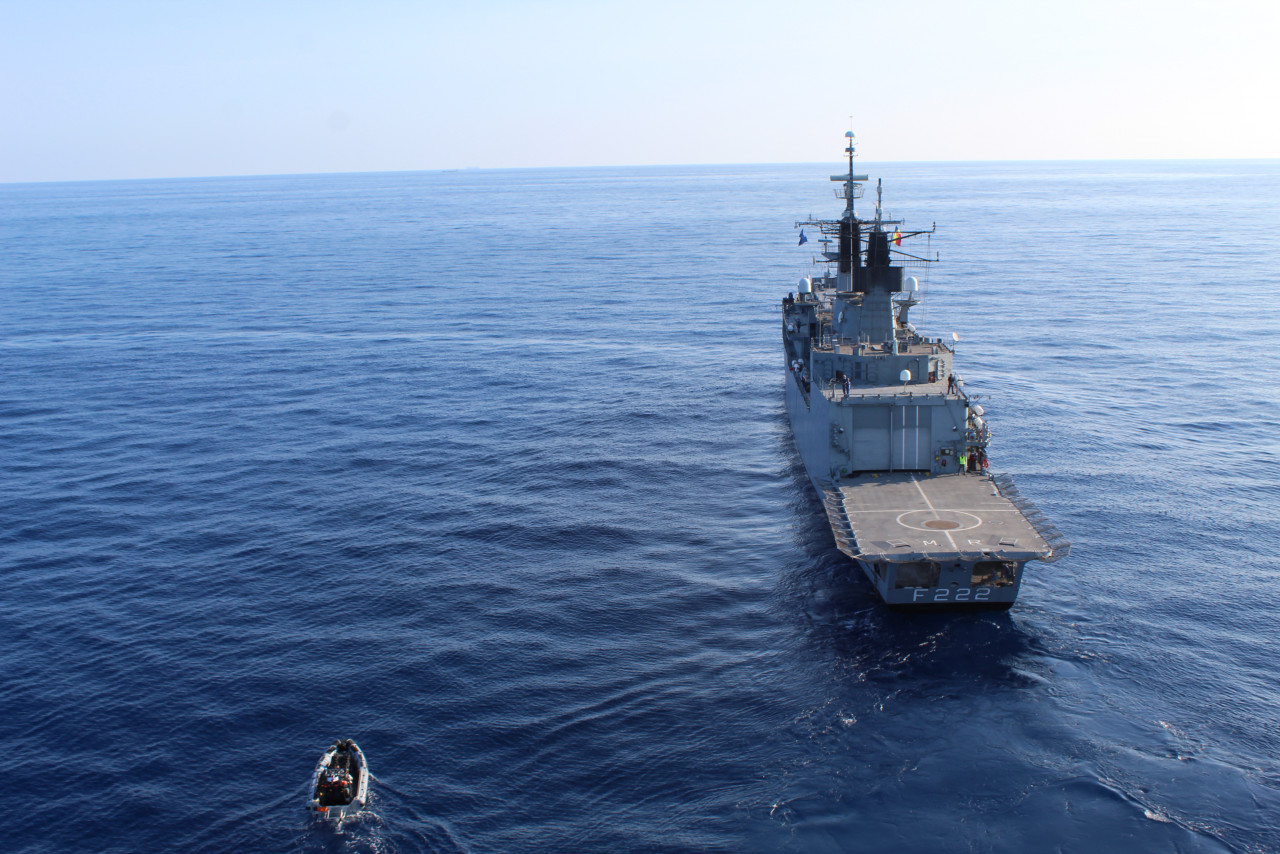 După plecarea din portul sicilian, cele două nave au executat sâmbătă, 13 septembrie, un antrenament comun pe mare, în cadrul căruia echipele de inspecție și control au exersat procedurile specifice domeniului interdicției maritime, prin inserția la bordul celor două nave. În același timp, elicopterul IAR-330 Puma Naval de la bordul fregatei românești a executat misiuni de zbor, pentru monitorizarea situației maritime.