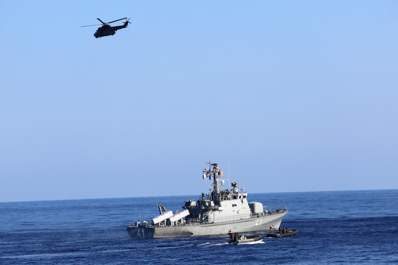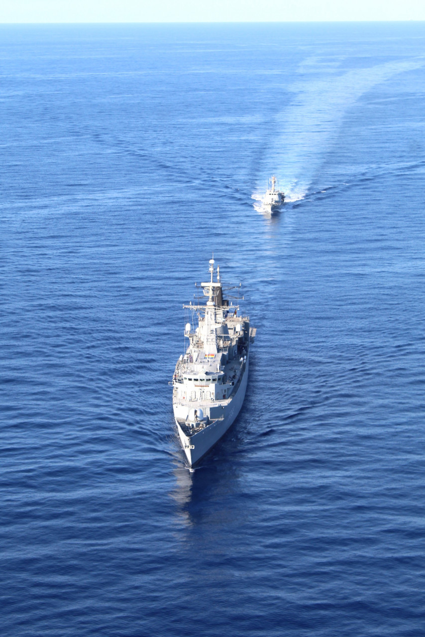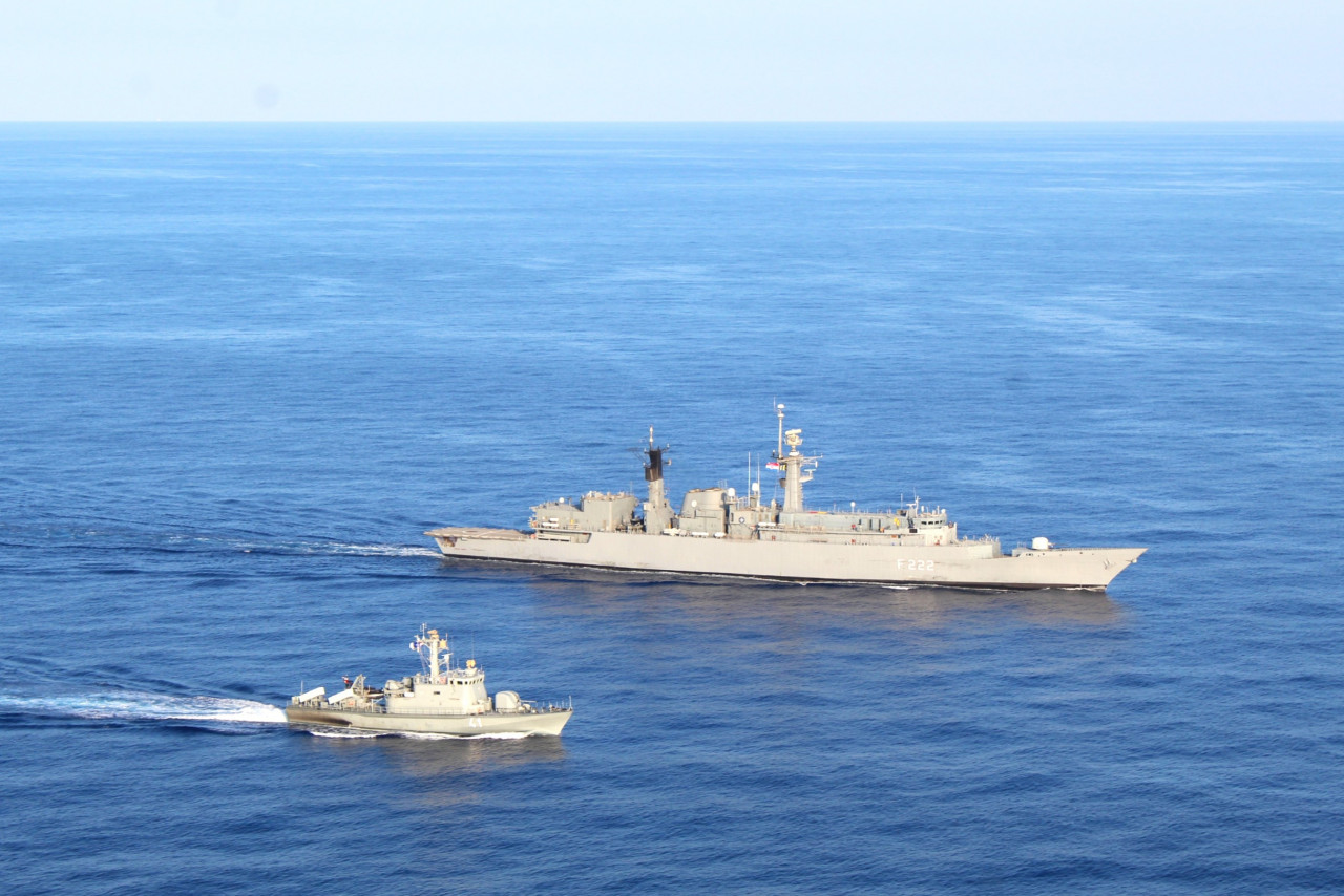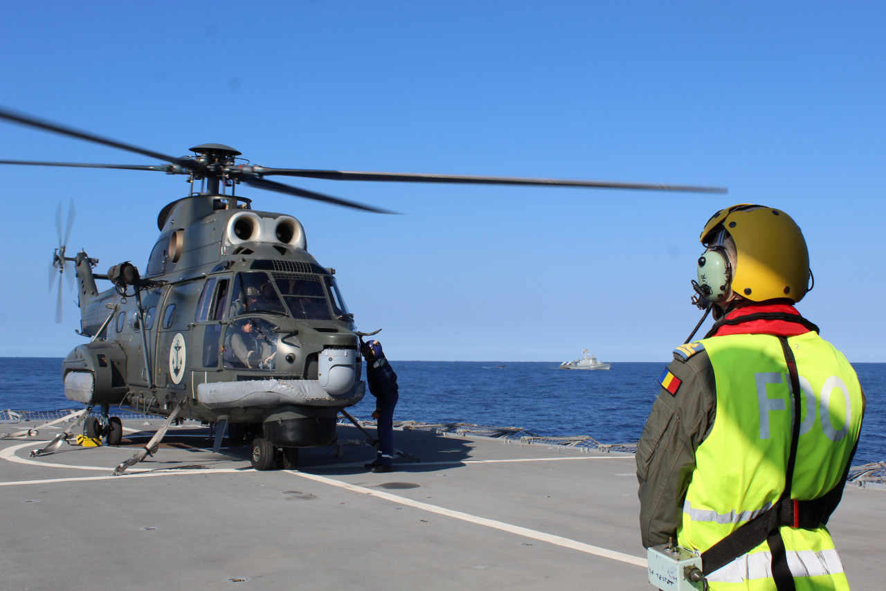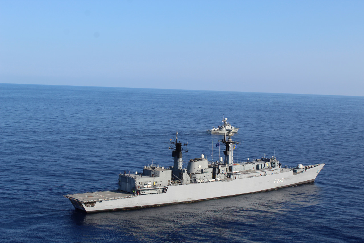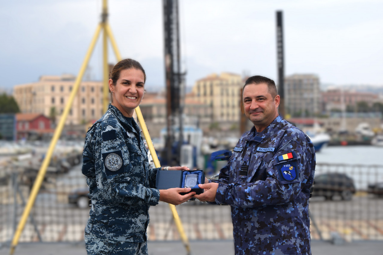 După plecarea din portul sicilian, cele două nave au executat sâmbătă, 13 septembrie, un antrenament comun pe mare, în cadrul căruia echipele de inspecție și control au exersat procedurile specifice domeniului interdicției maritime, prin inserția la bordul celor două nave. În același timp, elicopterul IAR-330 Puma Naval de la bordul fregatei românești a executat misiuni de zbor, pentru monitorizarea situației maritime.