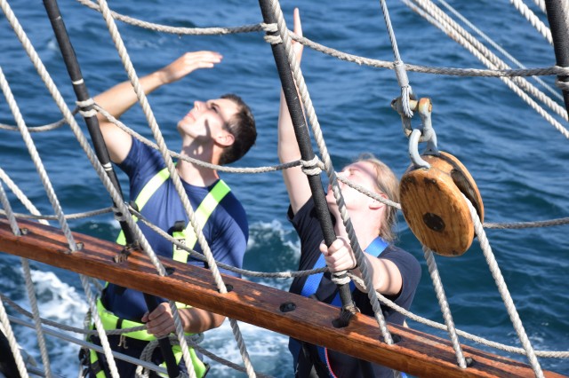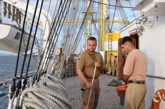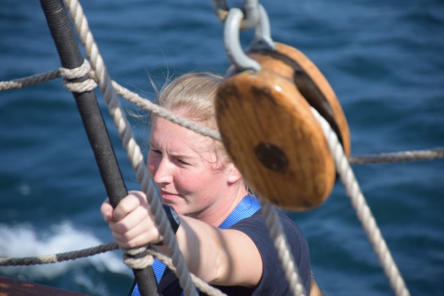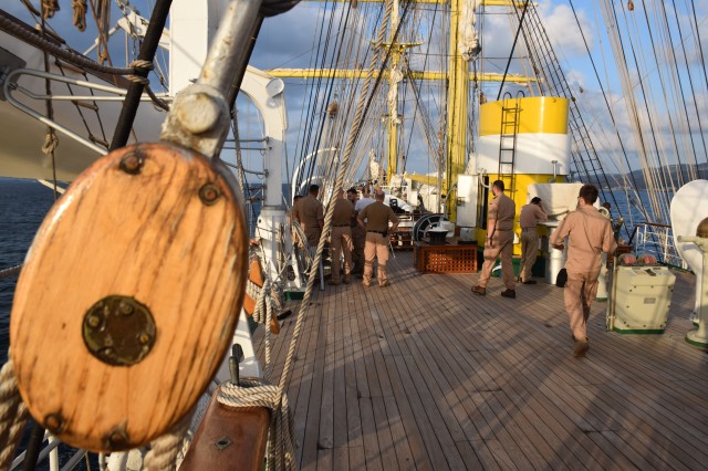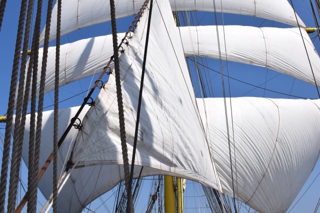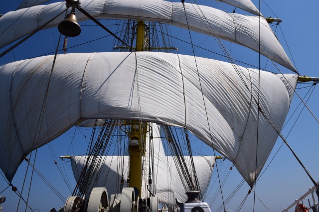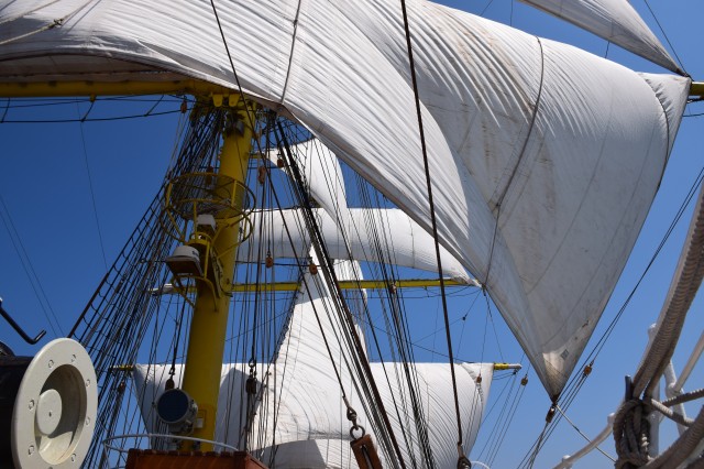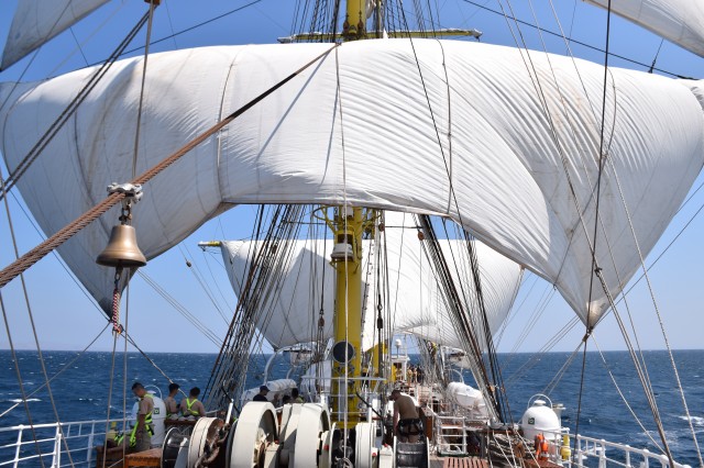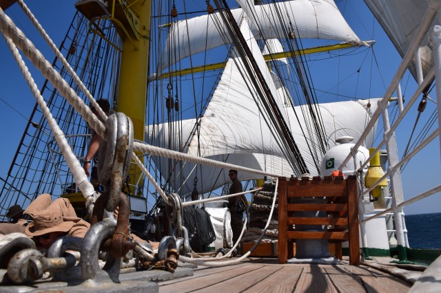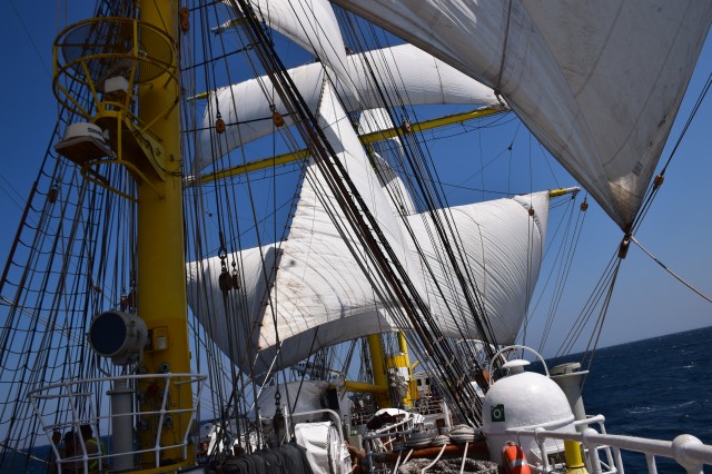 Ora 11 şi soneriile navei se aud din nou. „Pregătirea pentru urcarea în arboradă!” Profitând de vântul prielnic, deocamdată, comandantul navei a decis că este momentul pentru o nouă navigaţie cu vele. În mai puţin de o oră, cu anumite corecţii prin strângerea velei gabier de pe arborele pupa astfel încât velele arborelui trinchet să poată aduna vântul cât mai bine, nava s-a „aşezat” frumos în vânt şi pe mare. Doar instalaţia de ventilaţie de la sala maşinilor mai tulbură liniştea de la puntea centru şi dunetă. Cu un vânt de 5-6 metri pe secundă înaintăm constant cu o viteză de opt noduri. Pare incredibil dar în primele trei zile ale marşului este deja a doua navigaţie cu vele în condiţiile în care am tranzitat două strâmtori importante şi avem un program de respectat. Mai bine de atât nu se poate! Marşul a început extraordinar, toată lumea este sănătoasă şi cu moralul ridicat.